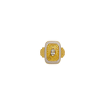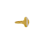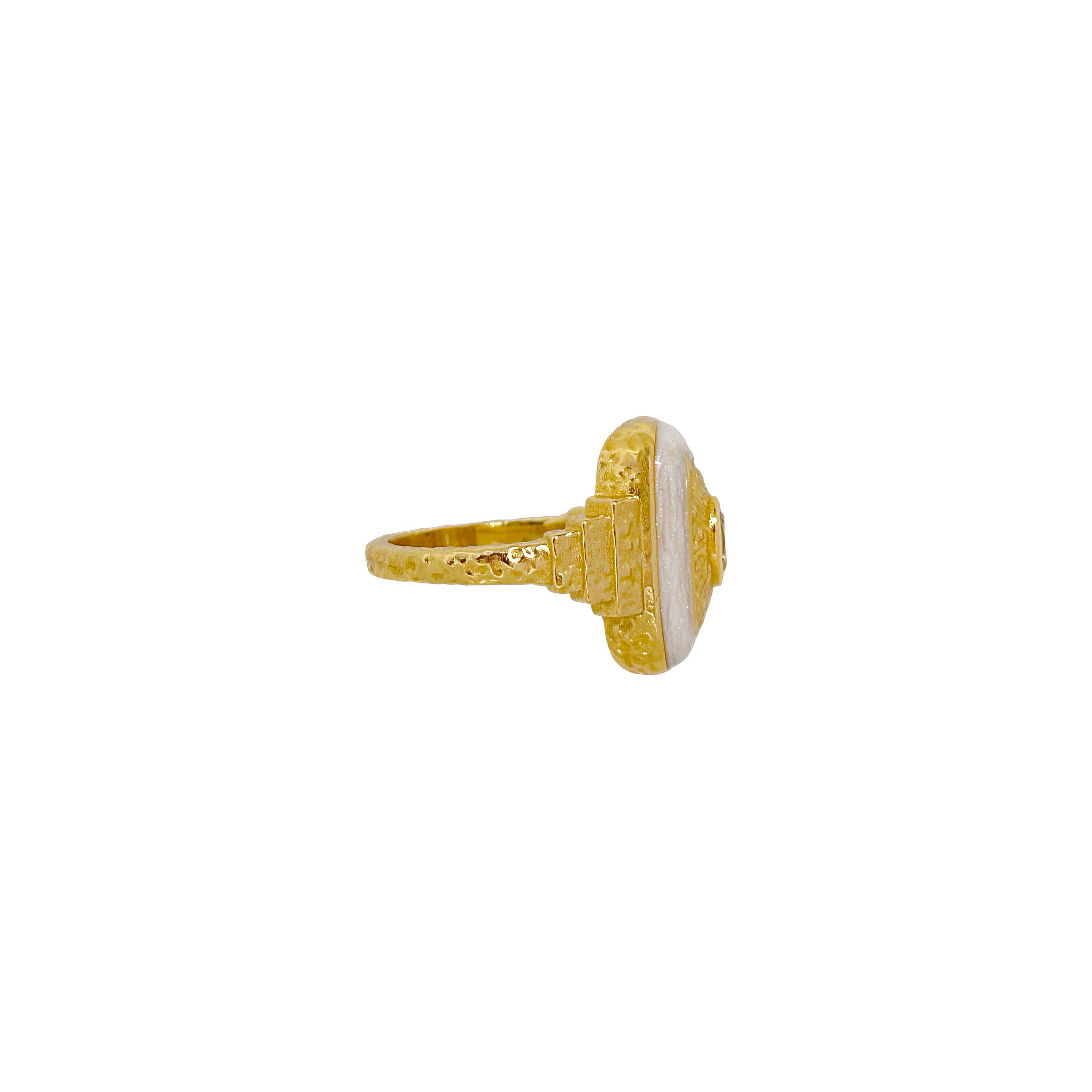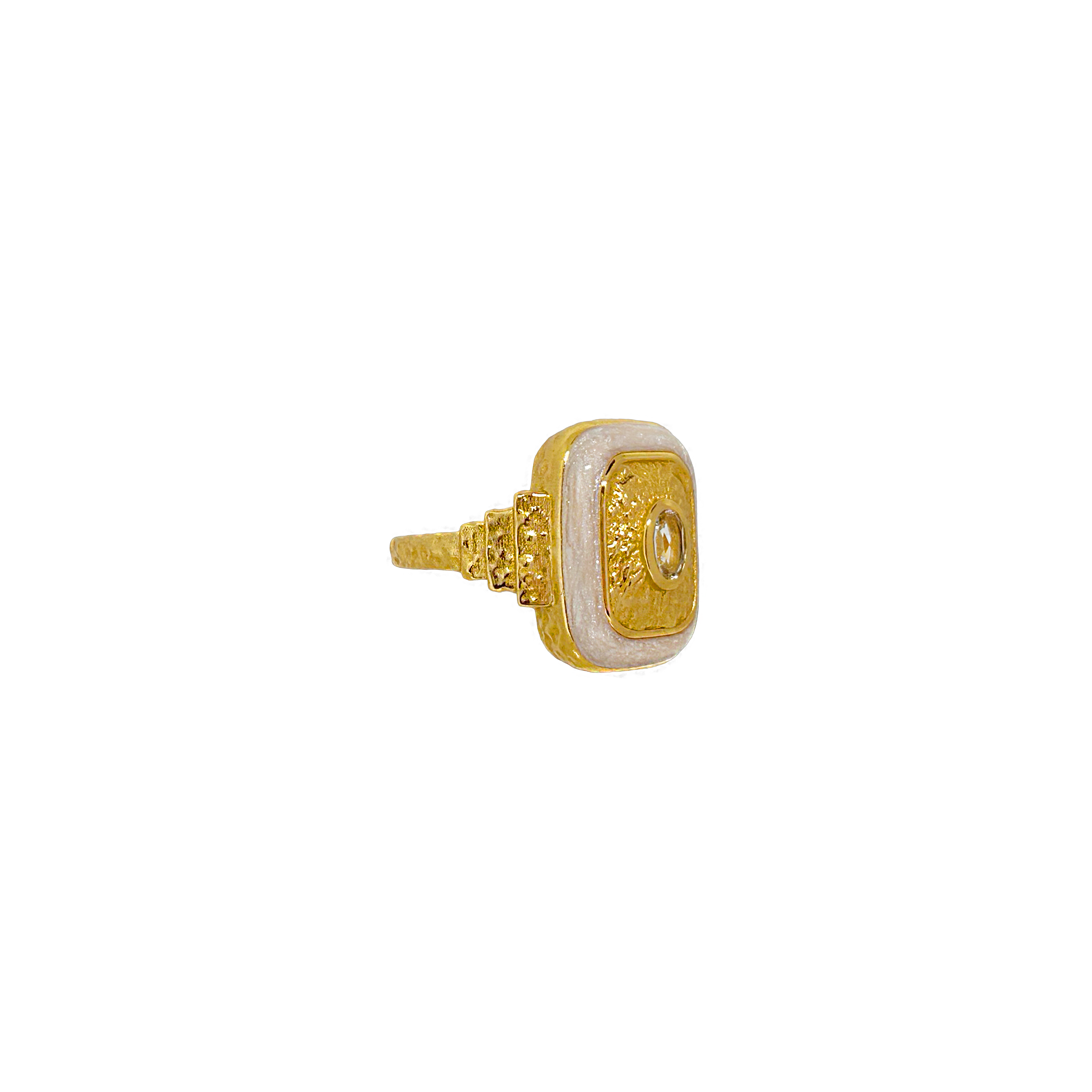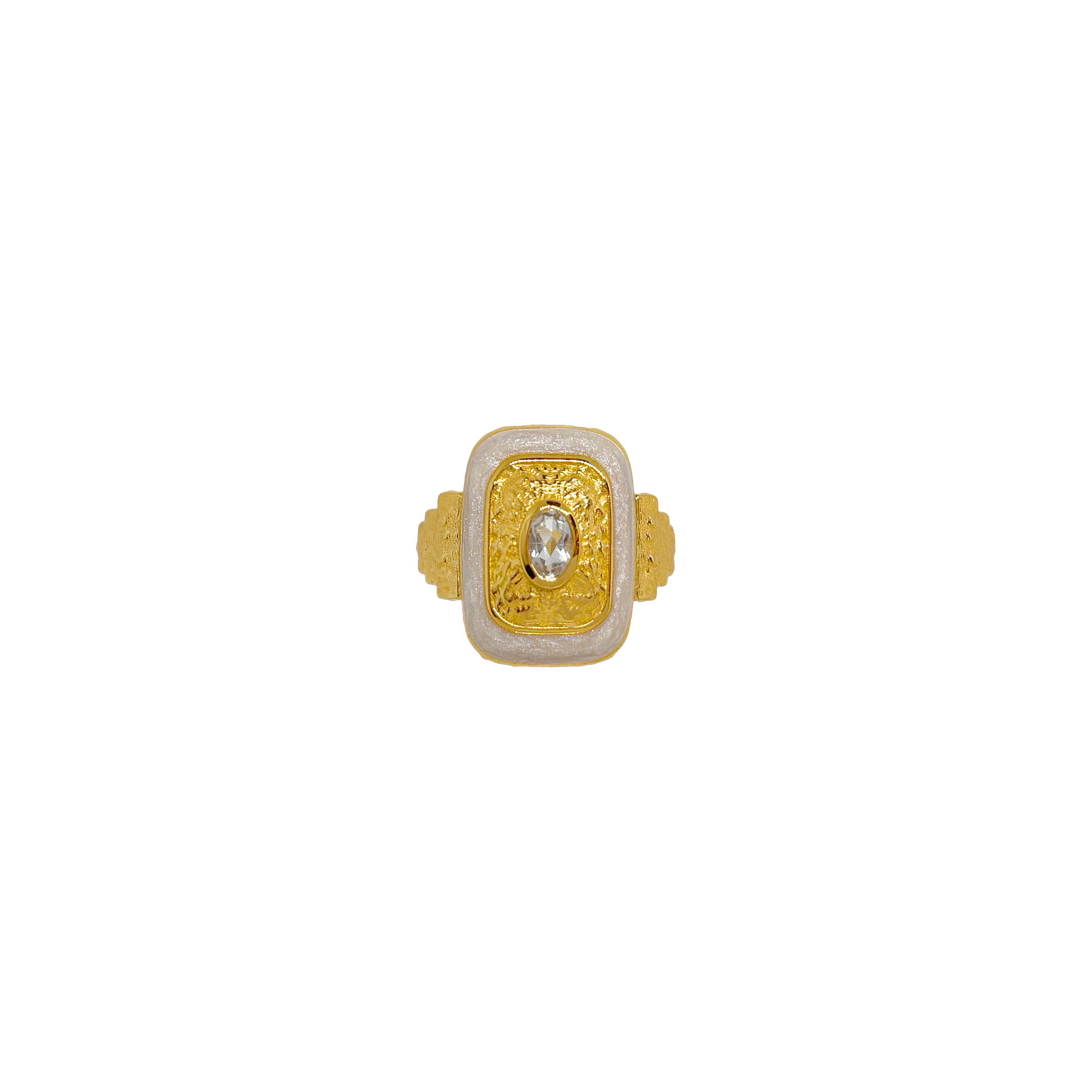 Introducing a fresh new take on our beloved Diana Ring. Bold yet refined, this ring is a celebration of contrast — High polish hammered gold, soft pearlescent enamel detailing, and a sparkling white CZ gemstone that catches the light with every move. Designed to stand out, it brings a touch of regal elegance and modern edge to your every gesture, perfect for making a forever statement.