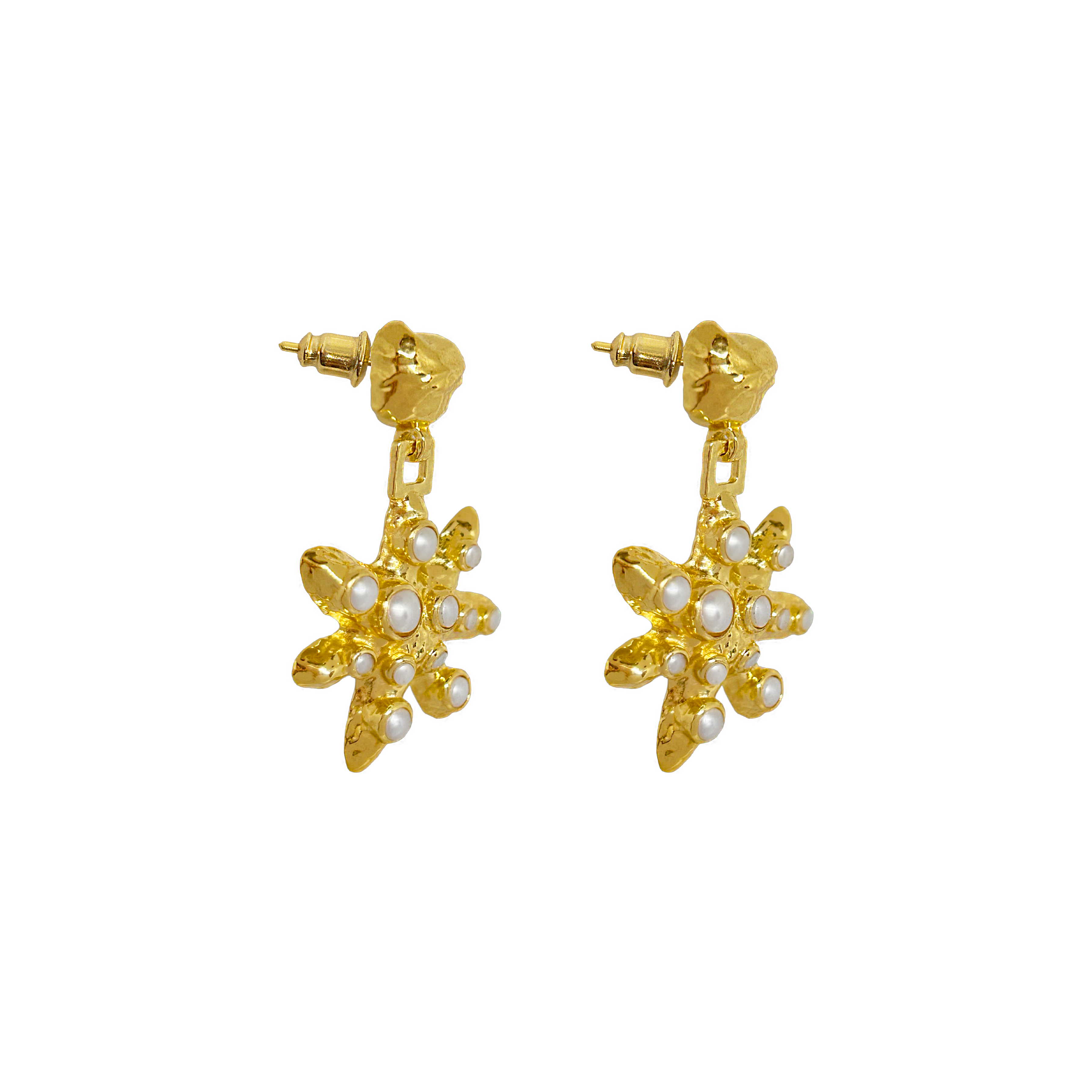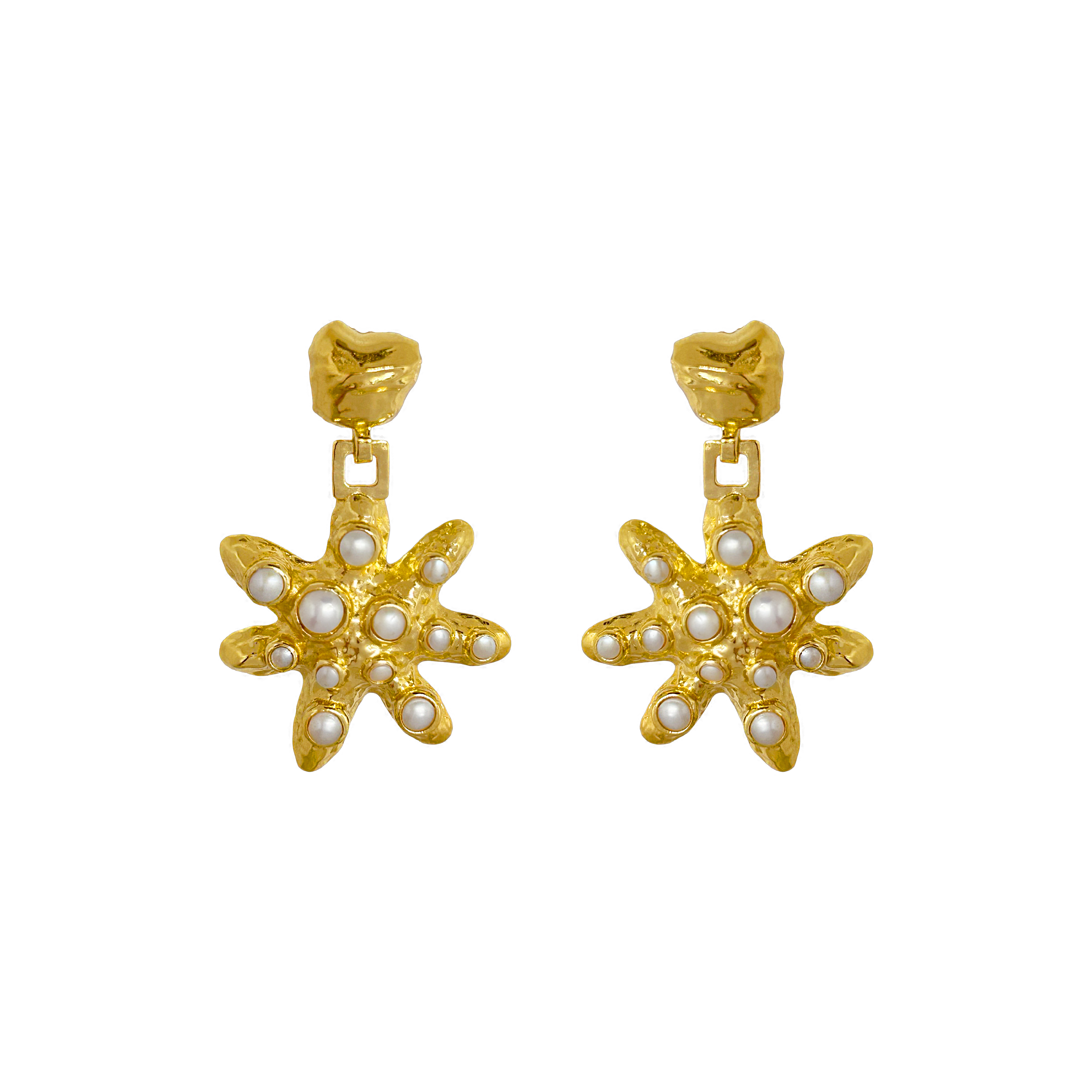 Rooted in artisanal tradition, the Pari Earrings reimagine one of our best-selling star motifs with new depth and decadence. Handcrafted using our signature MM techniques, the design features a hammered texture contrasted by a high-polish finish — a celebration of detail and duality. Encrusted with luminous freshwater pearls, each piece brings a sculptural elegance to the everyday, making it a standout for the modern woman who treasures craftsmanship with a twist.
