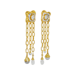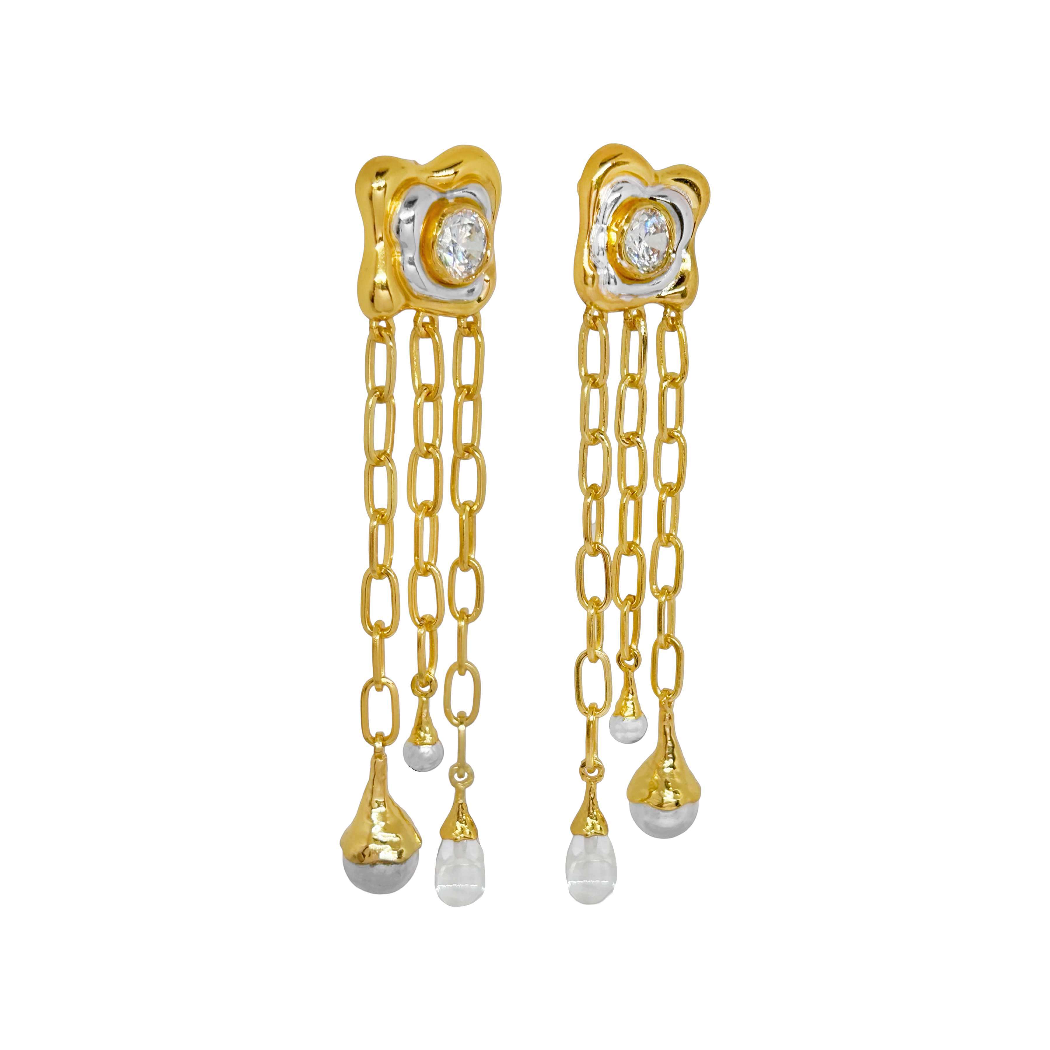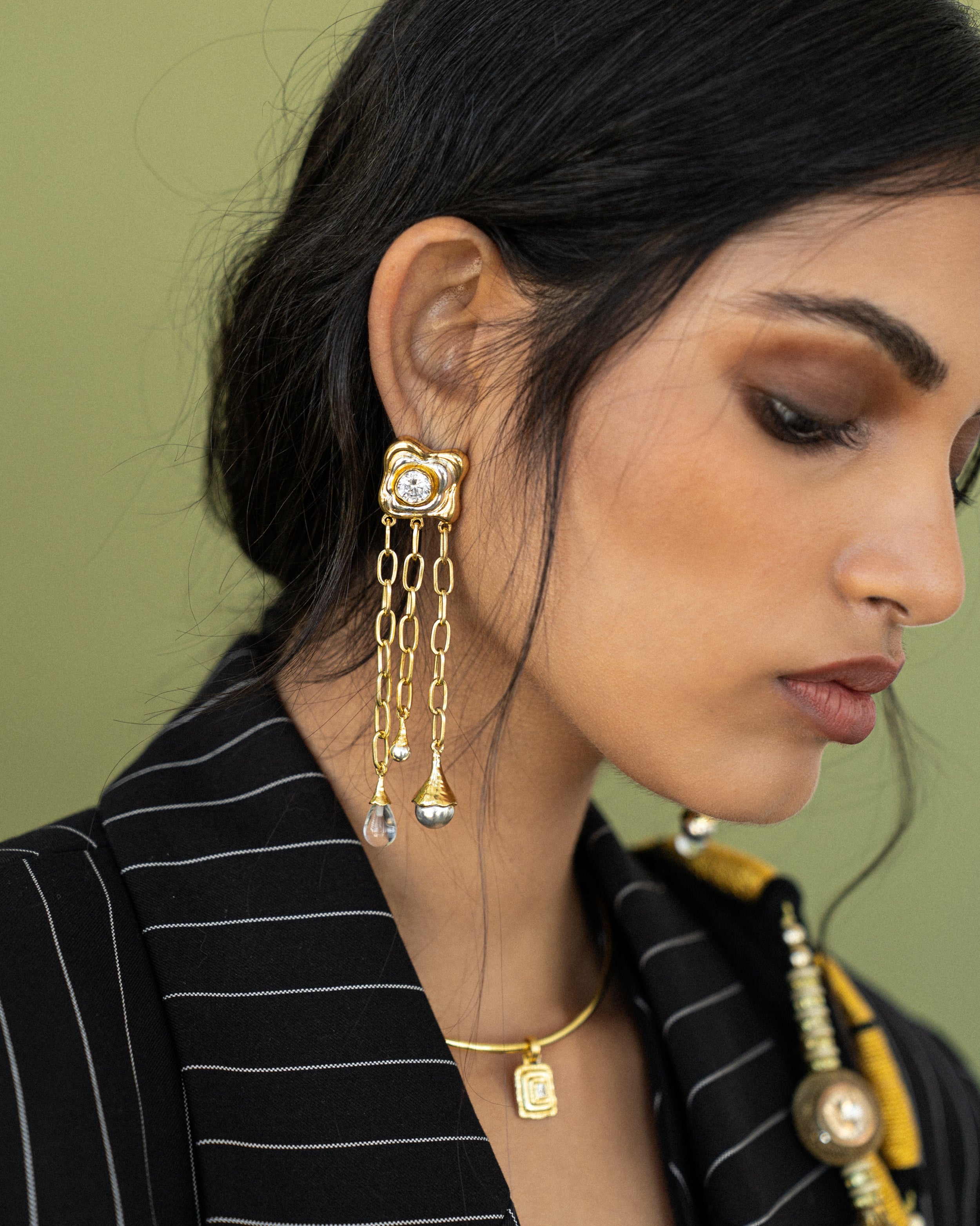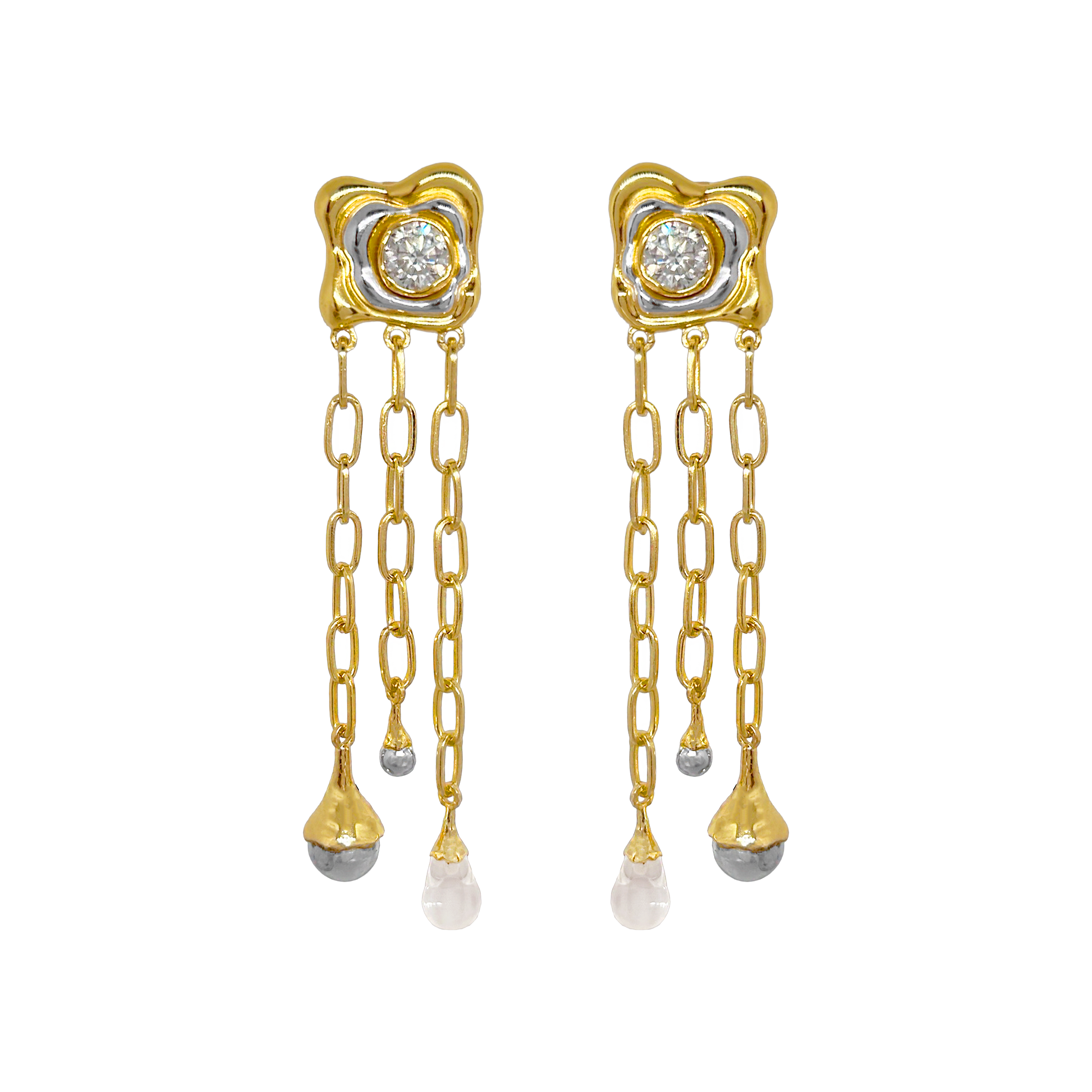 The Rochelle Earrings bring fluid movement and modern elegance to classic form. Crafted in mixed metals with a sculptural stud and cascading chain drops, each link is delicately detailed, catching the light with every sway. Sparkling White CZ accents and Crystal Quartz droplets add a soft shimmer, making these earrings a refined statement for the modern woman — bold, graceful, and effortlessly current.