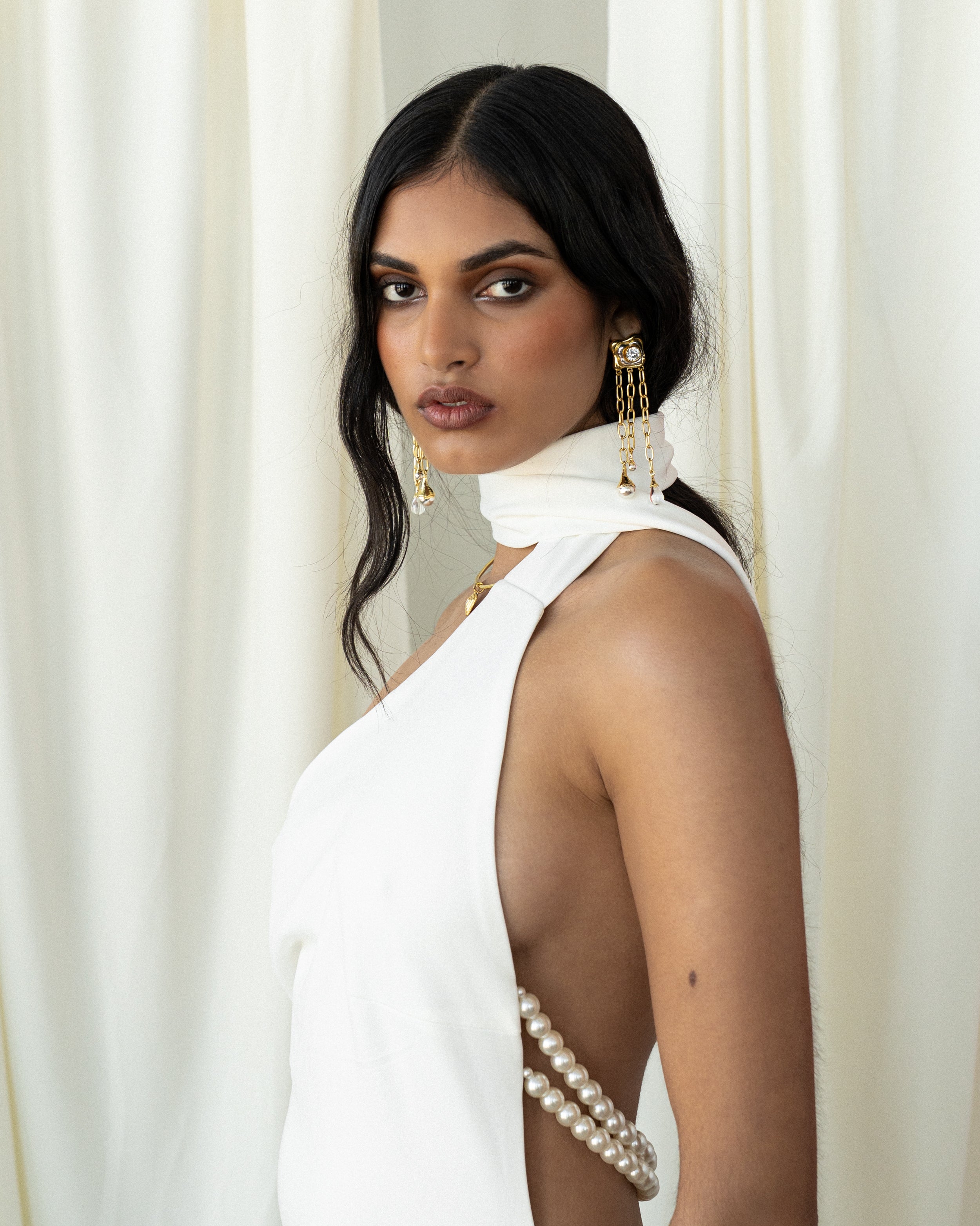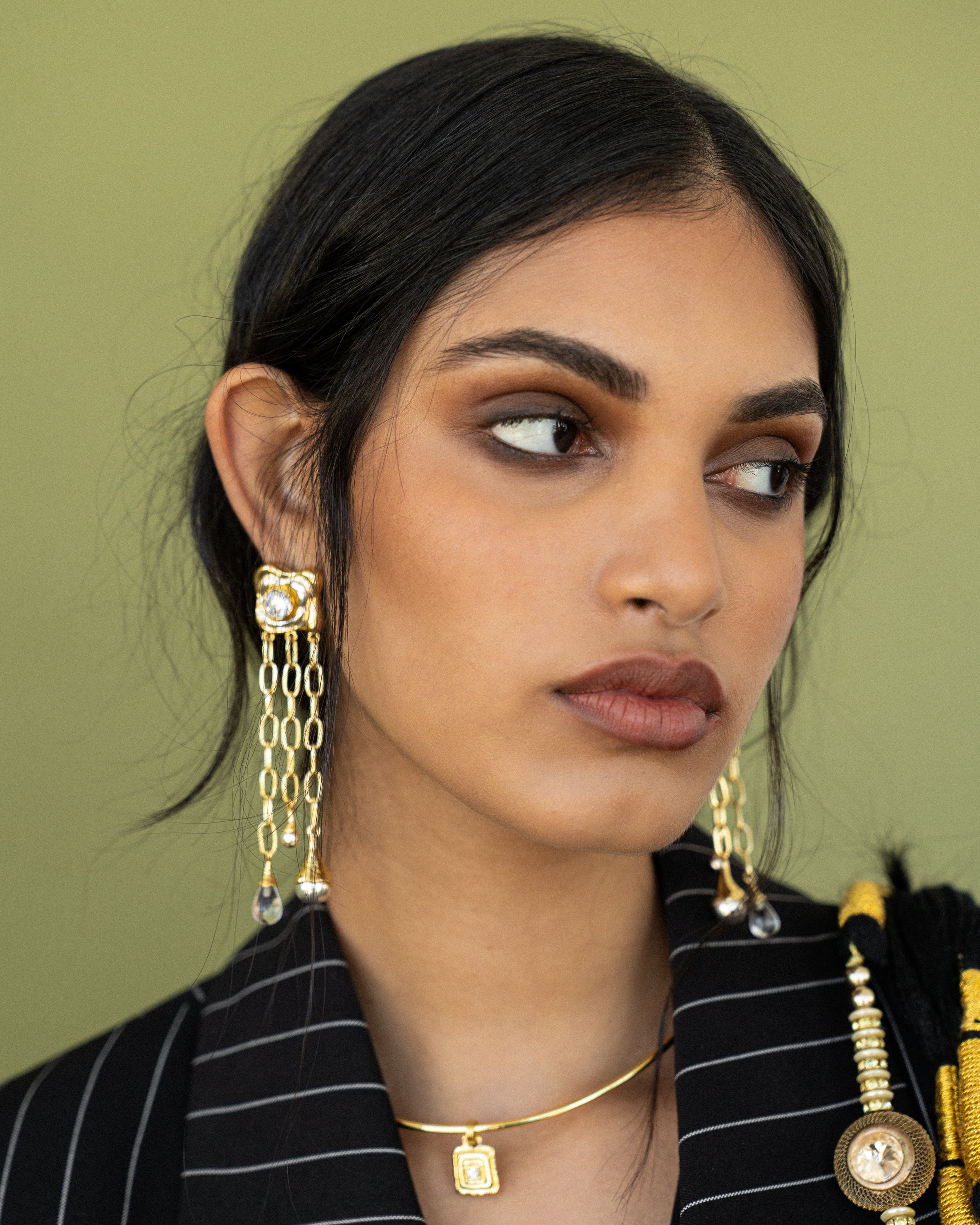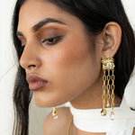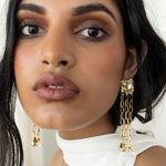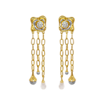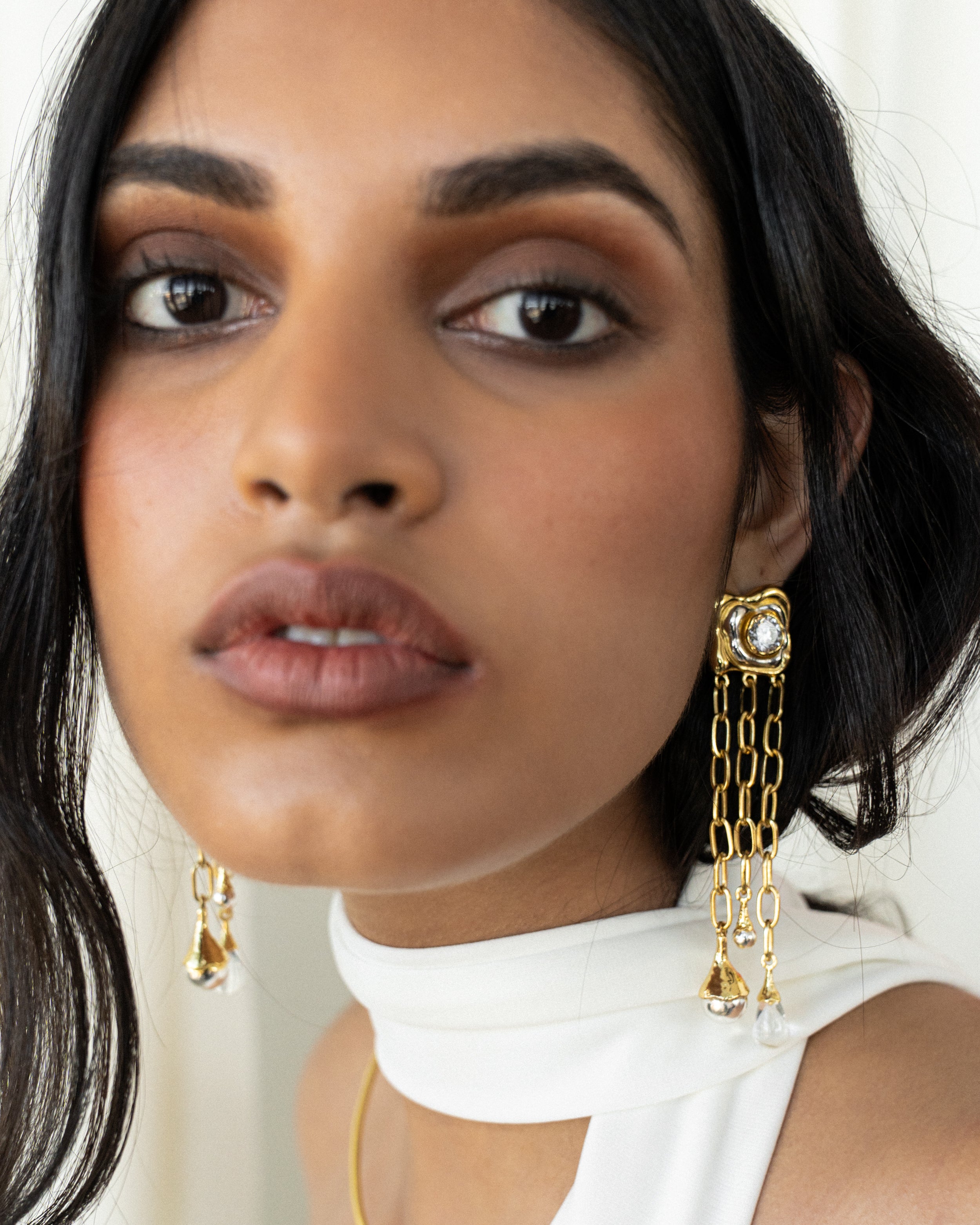 The Rochelle Earrings bring fluid movement and modern elegance to classic form. Crafted in mixed metals with a sculptural stud and cascading chain drops, each link is delicately detailed, catching the light with every sway. Sparkling White CZ accents and Crystal Quartz droplets add a soft shimmer, making these earrings a refined statement for the modern woman — bold, graceful, and effortlessly current.