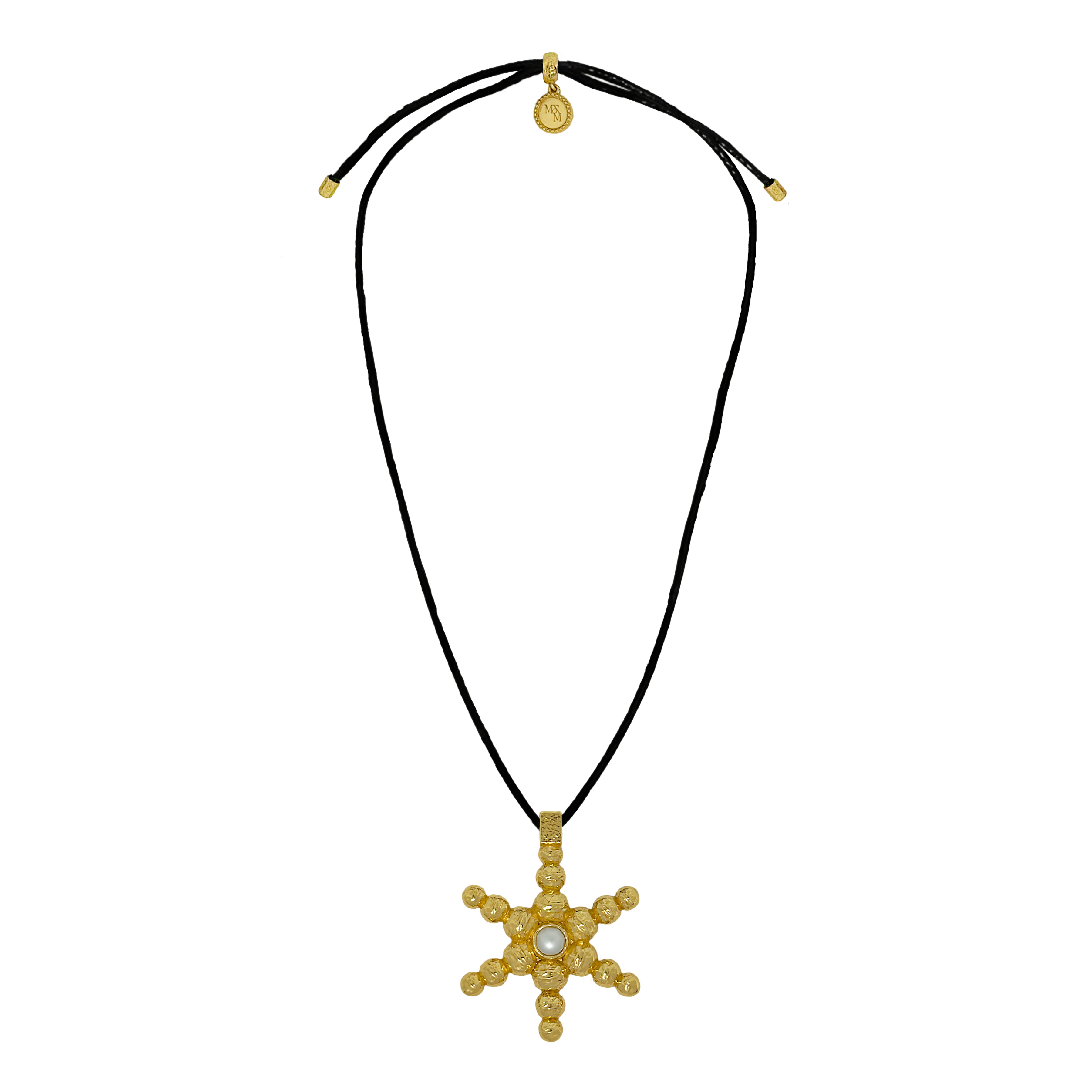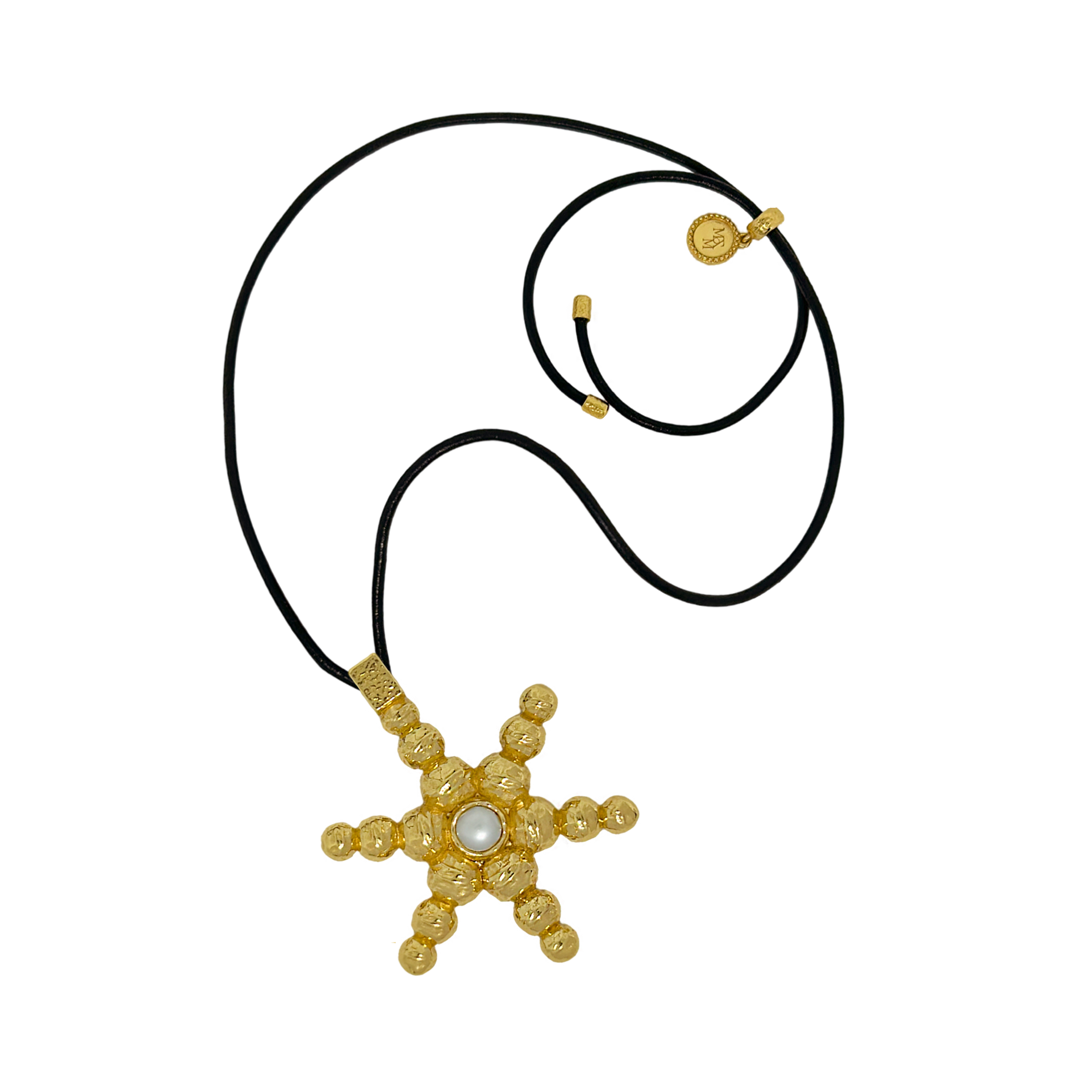 A celestial emblem of guidance and adventure, the Atlas Necklace blends mythic symbolism with '90s edge. Featuring a radiant gold star pendant set with a luminous freshwater pearl, and suspended on a sleek black leather cord, this piece redefines nostalgia through the lens of Greek antiquity.