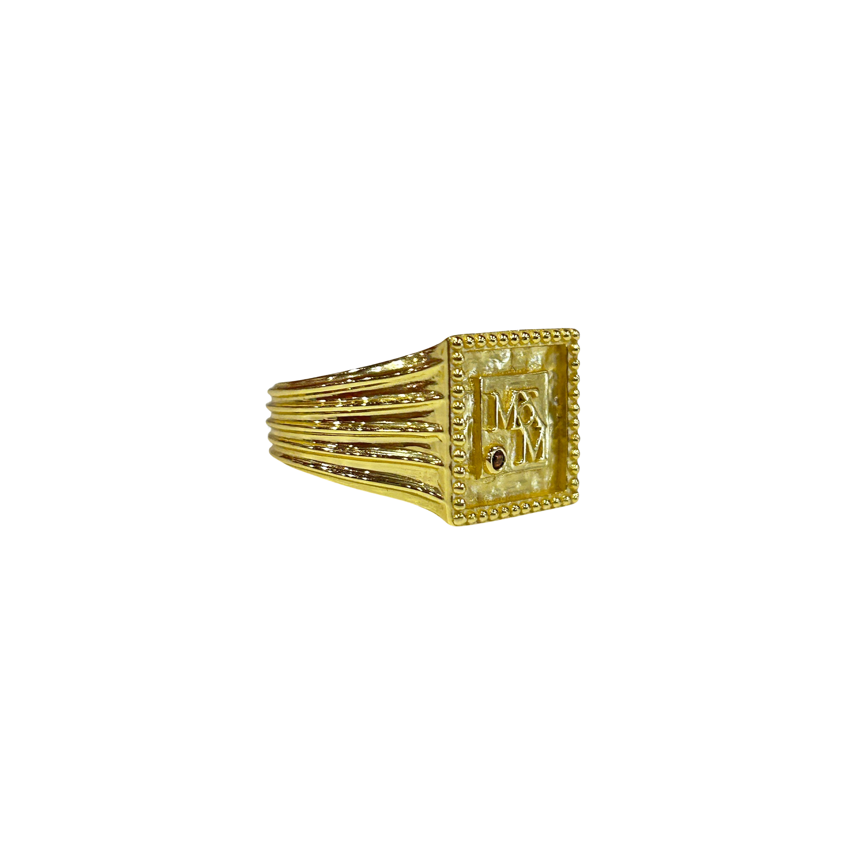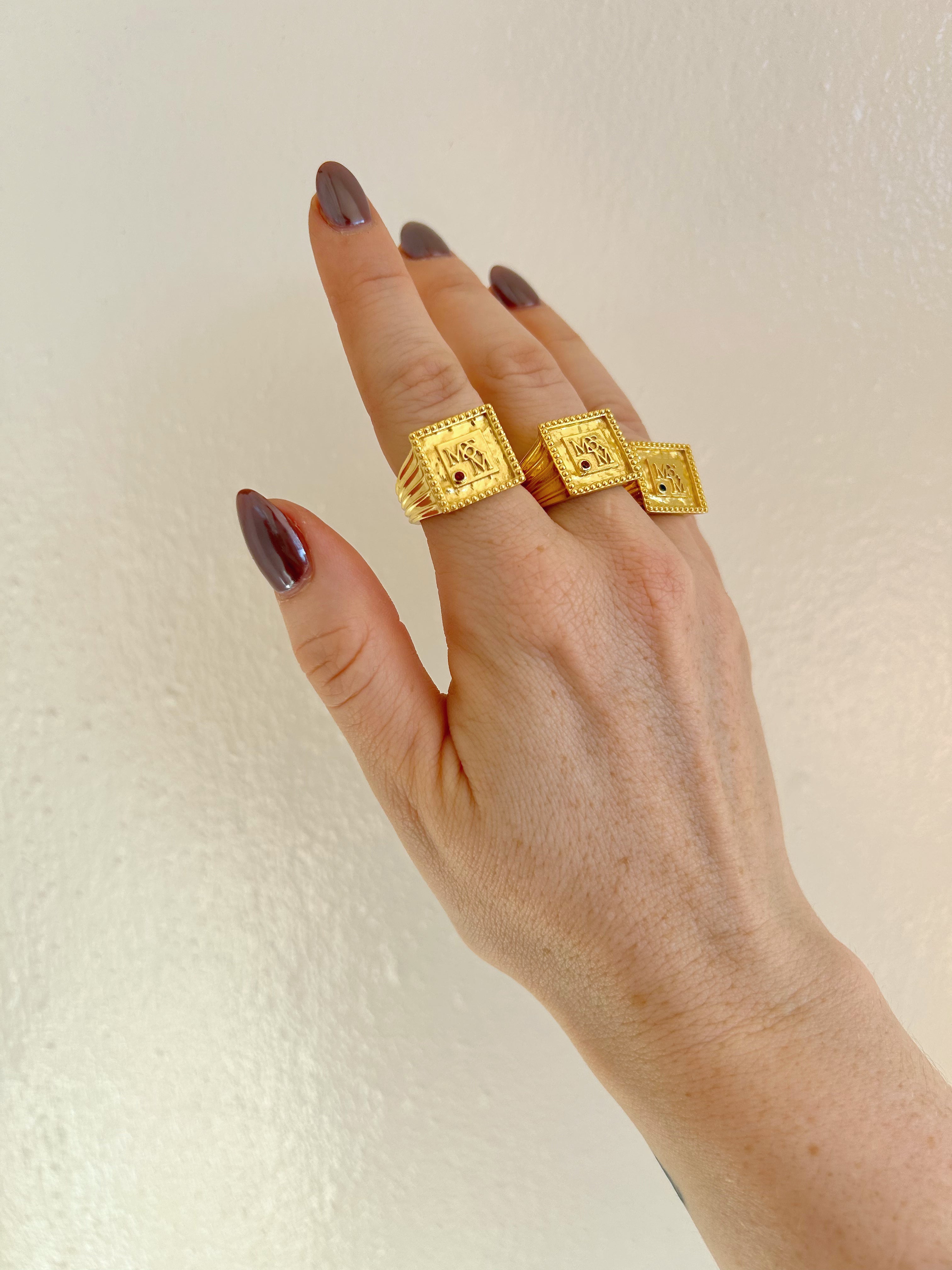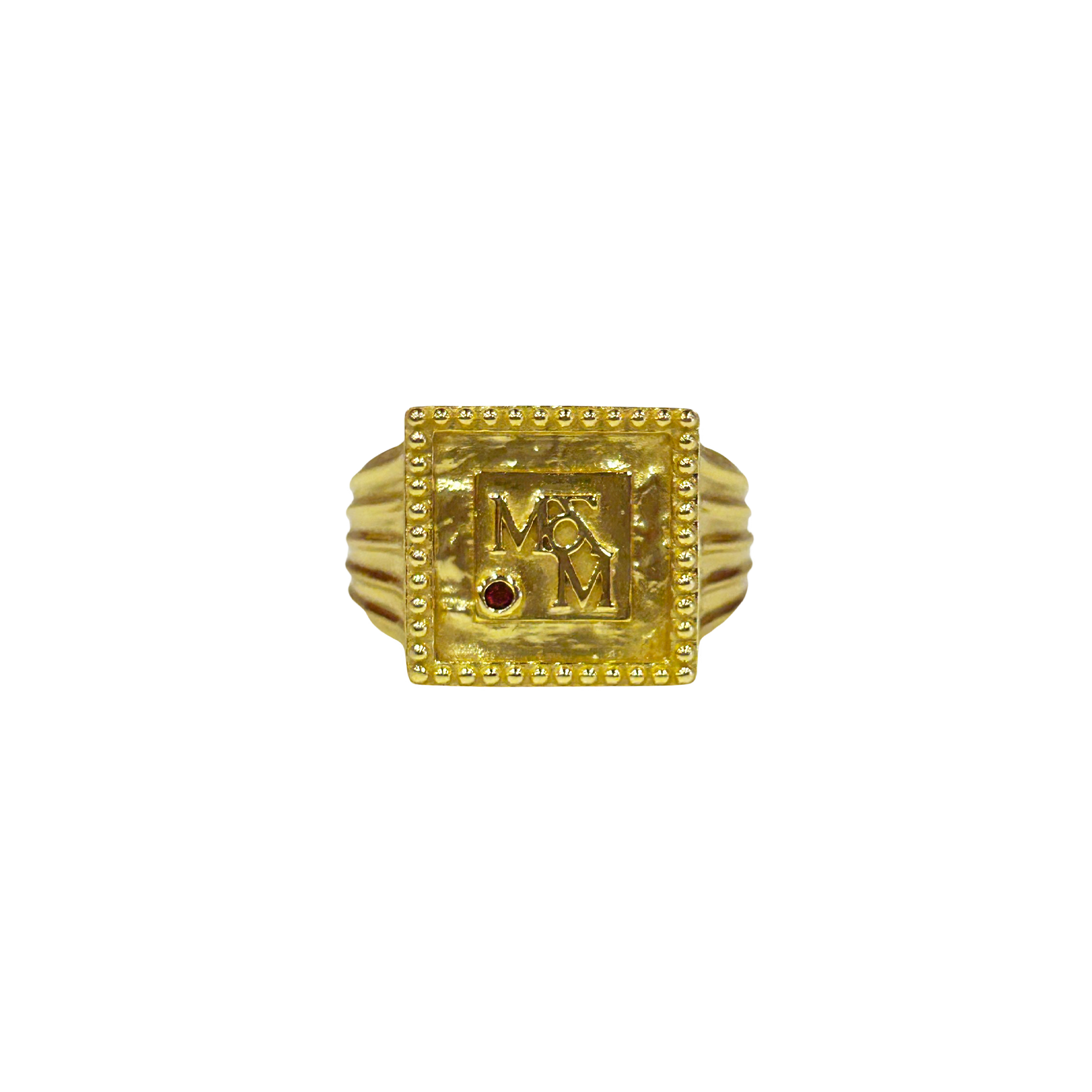 Our MM Signet is a special piece.  An iconic signet style ring taken to the next level with our signature rava ball design and the MM logo shining bright in the centre with an inset garnet. Up the WOW factor on your ring party with this bold and beautiful design that is sure to send compliments your way!