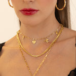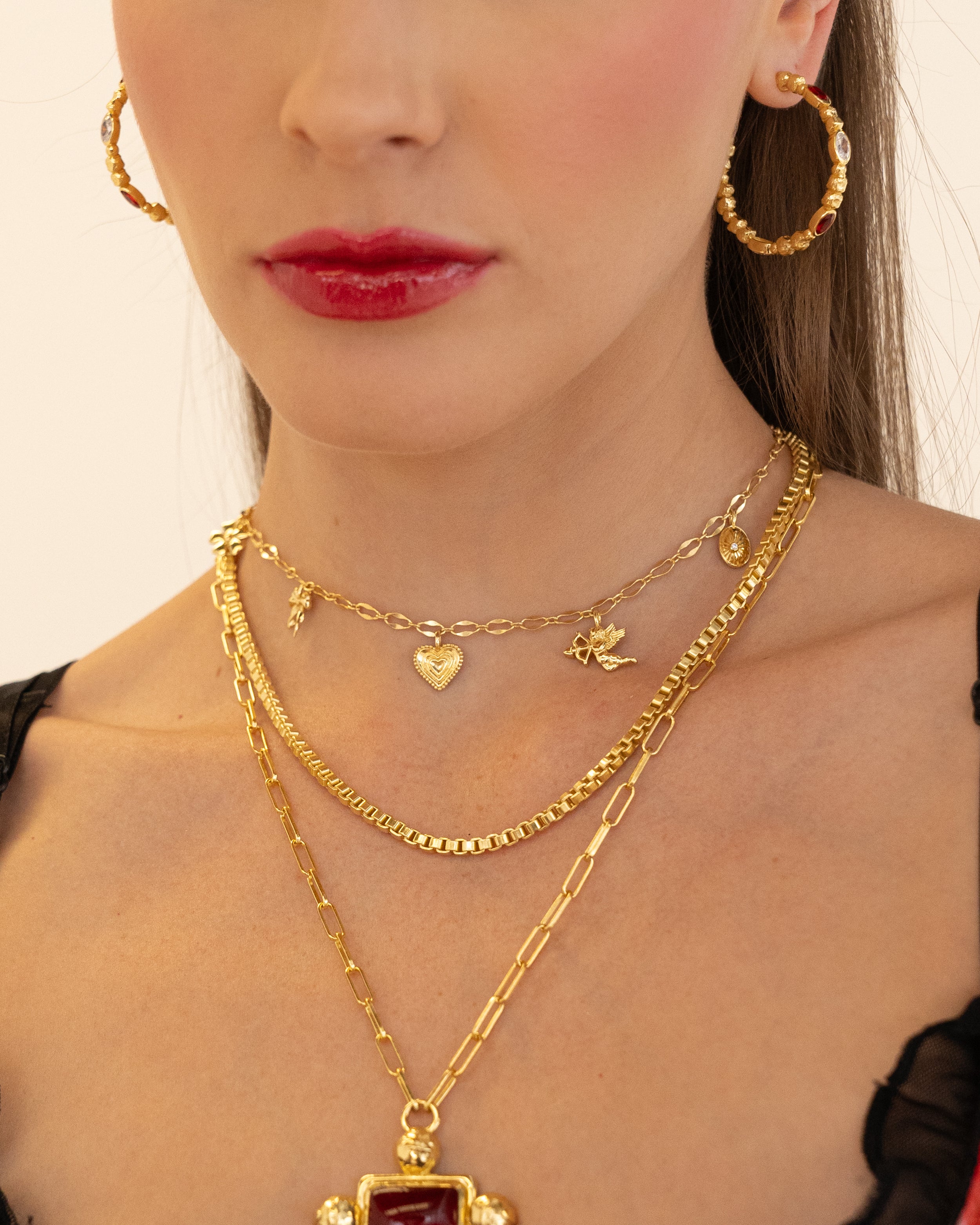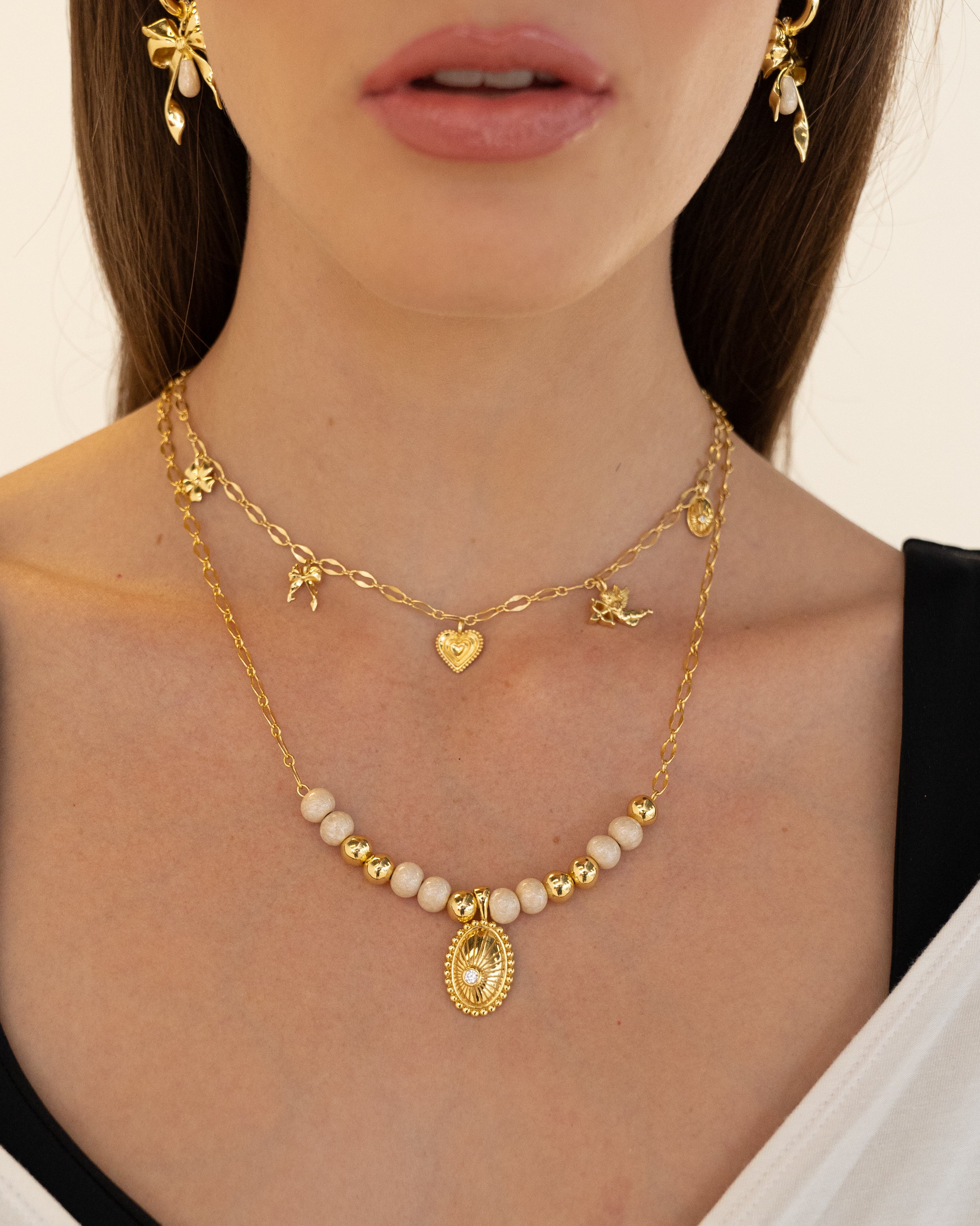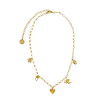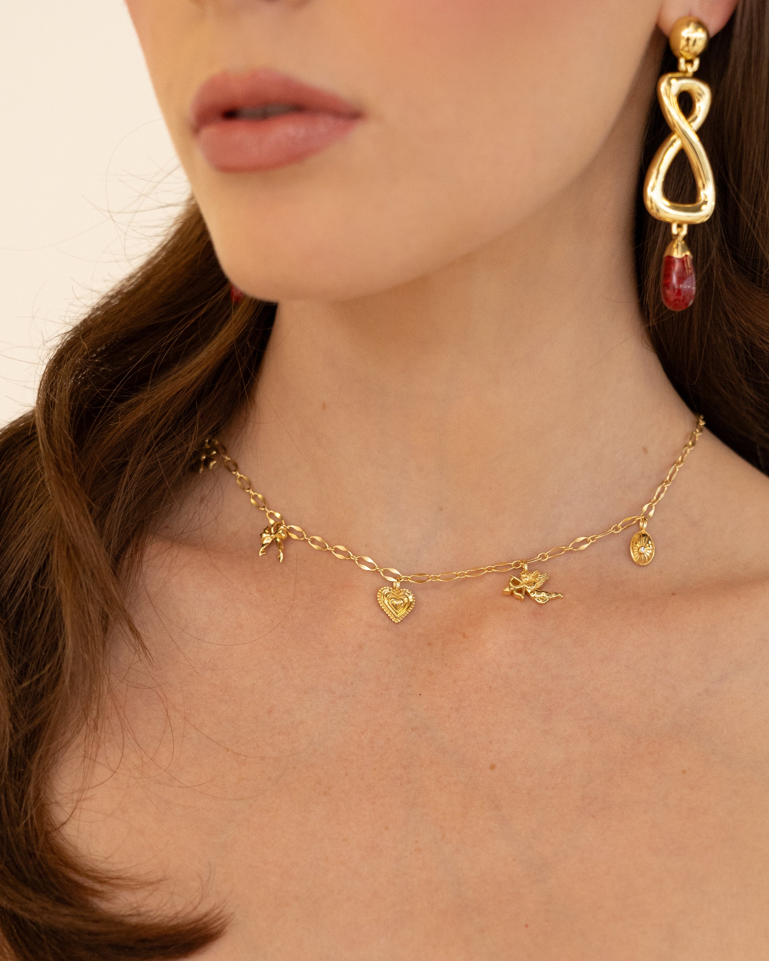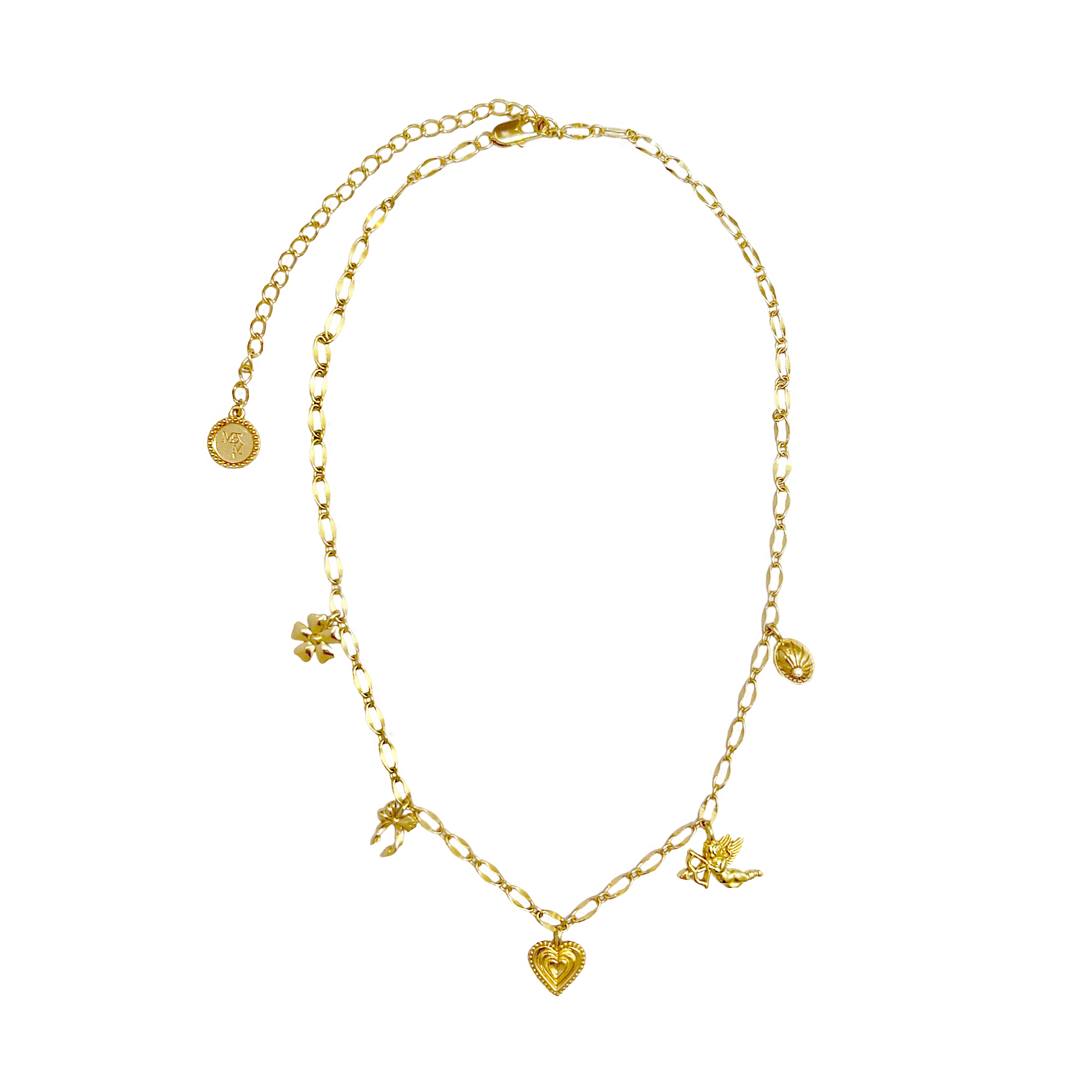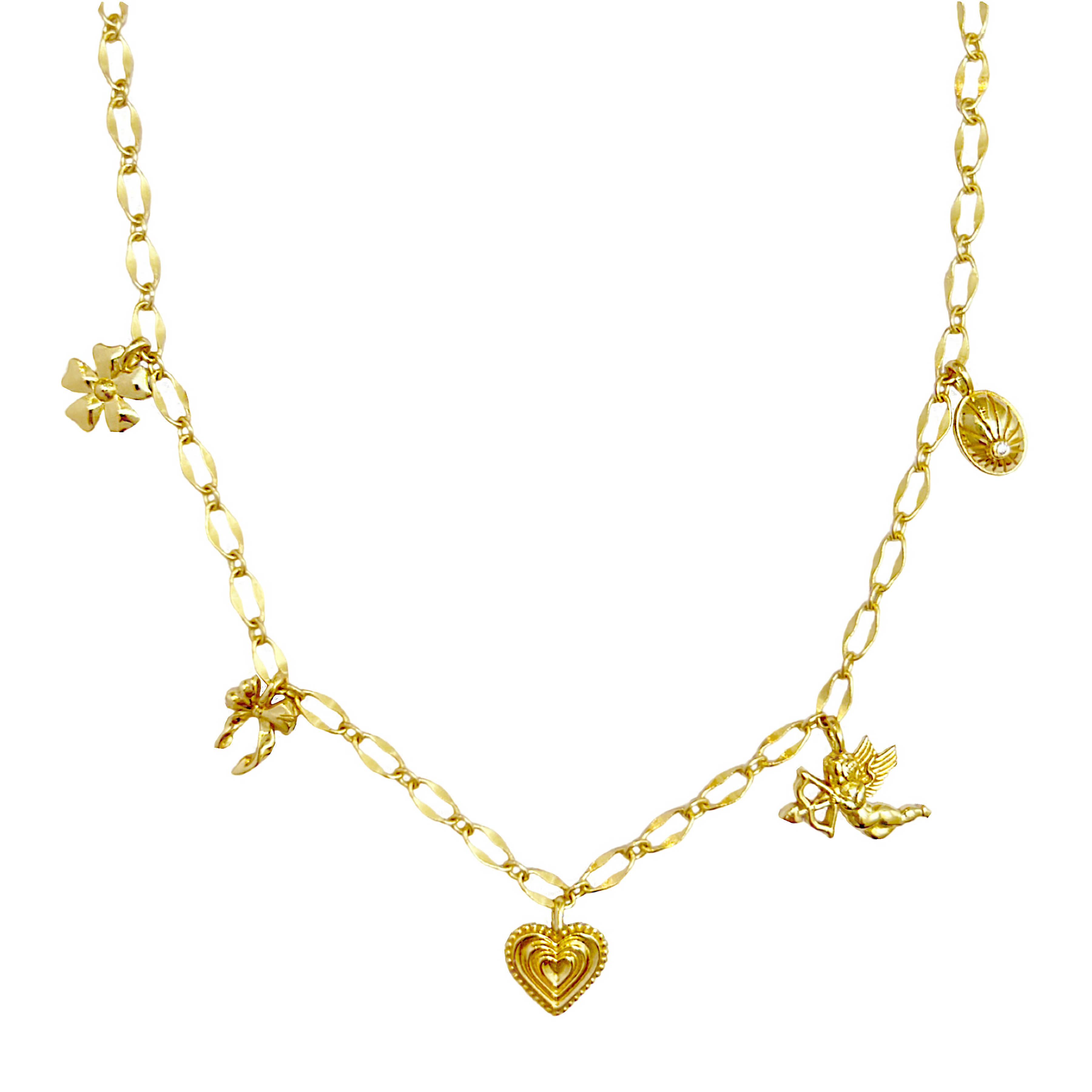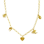 Hello Angel! Introducing the prettiest, most delicate necklace of the collection. The romantic and charming Angel Necklace is bound to steal your heart with its nostalgic, feminine touches featuring a few of our favourite motifs... the flower, bow, heart, cupid and locket, exquisitely strung on an iridescent chain. She is soft yet striking and will have your style float from day to night with ease. So go ahead, indulge in a little romance and charm with this darling necklace.