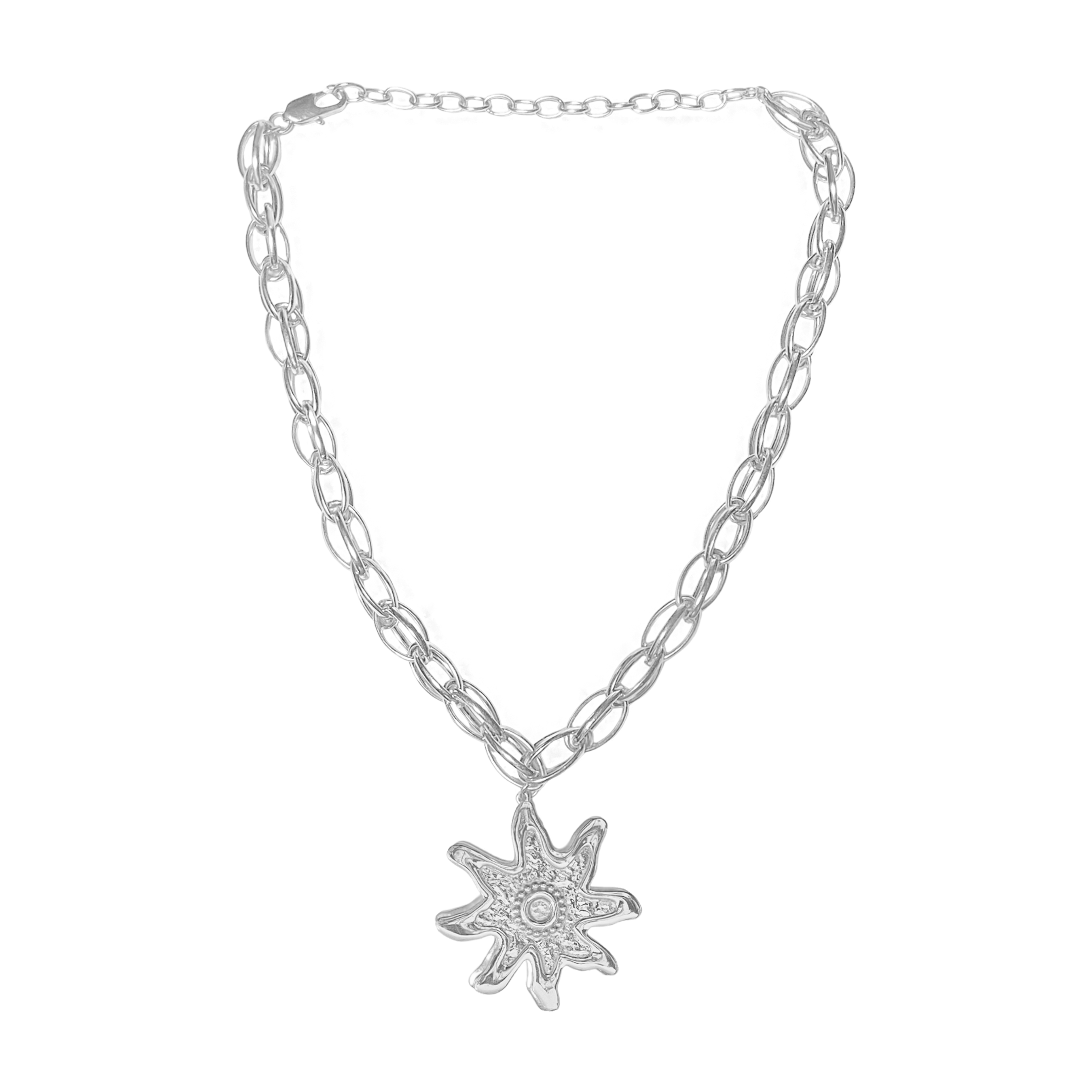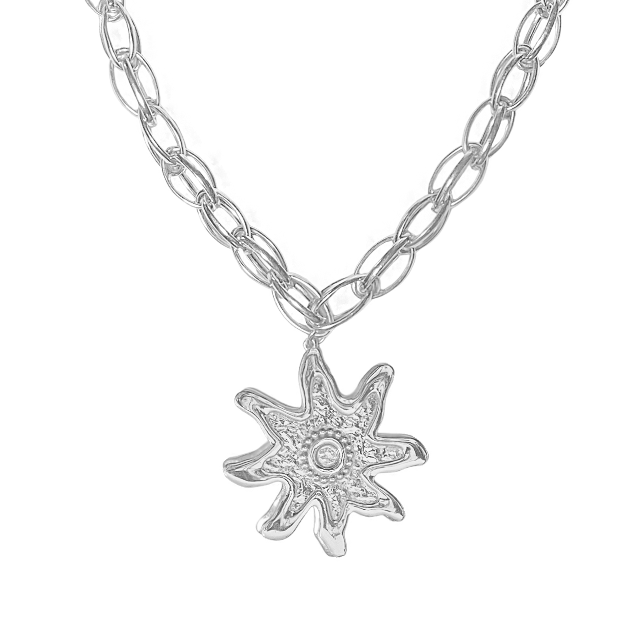 The Aria Necklace is an iconic style from our collection that has become a staple in every MM girl's rotation. The most beautiful orb detail silver chain with iconic Star motif pendant, ensures this standout piece stays bold yet feminine. Crafted with our signature hammered texture the Aria Necklace has a vintage touch but feels fresh and unique, its eye-catching design will make it a timeless addition to your jewellery collection.