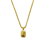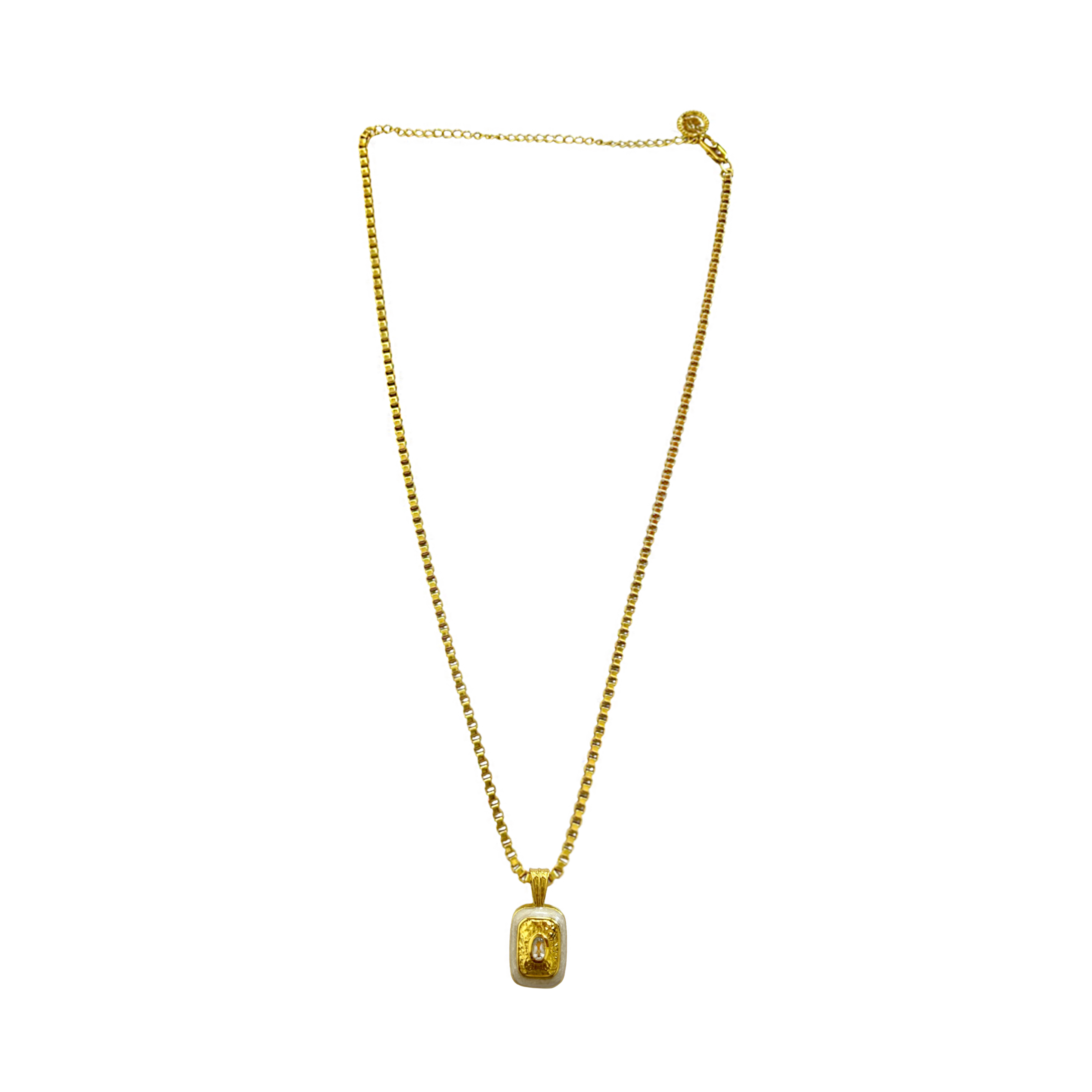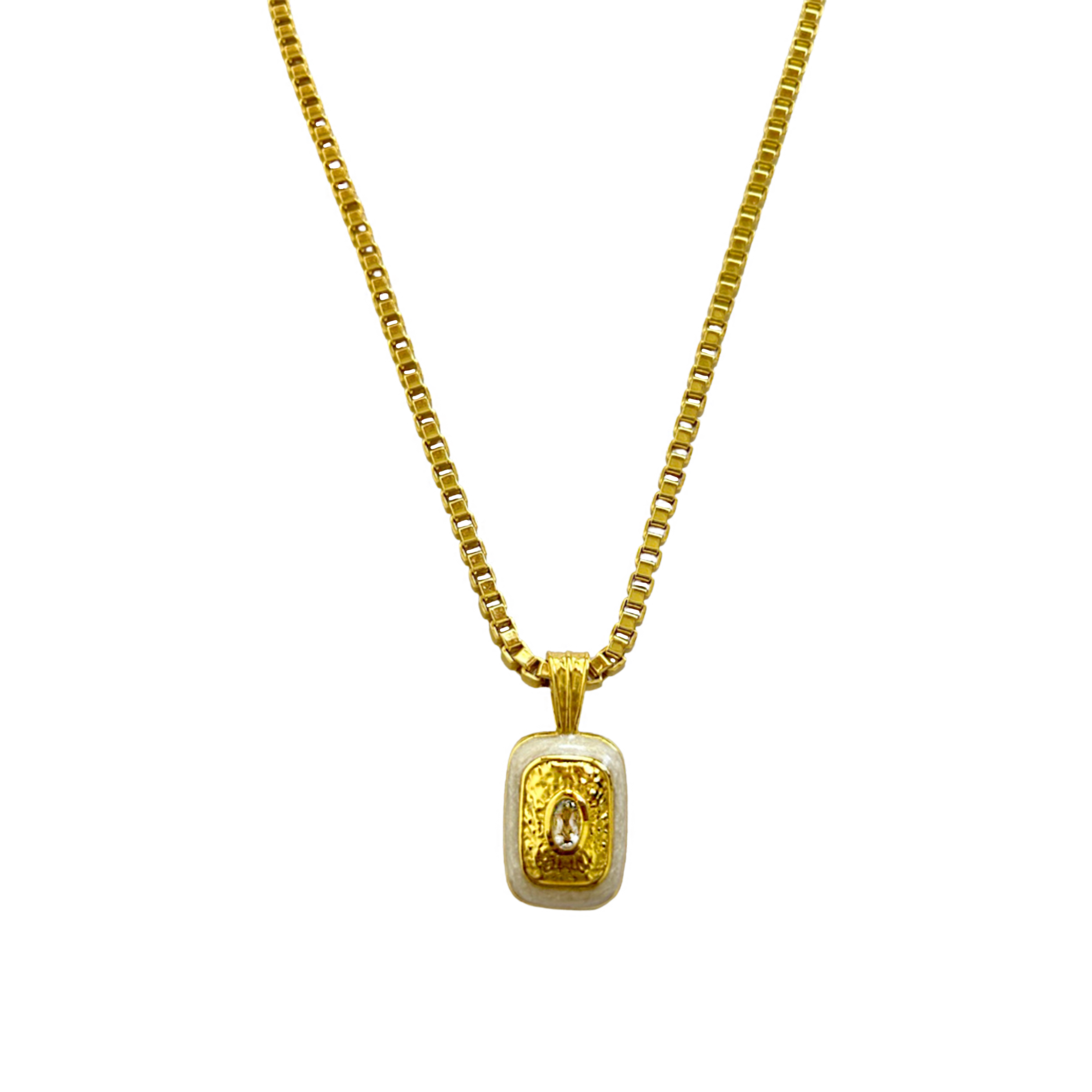 Introducing the Eva Necklace, she is vintage glamour at its finest with a playful edge in true MM fashion. She will have you feeling sexy, bold and sophisticated with any outfit day or night. Starring the Mirage motif... a beautifully crafted rectangular pendant featuring hammered gold texture,  vintage pearl enamel and an eye-catching faceted Crystal Quartz gemstone. Eva is a showstopper all on her own and also perfect for layering. You won't want to ever take Eva off!