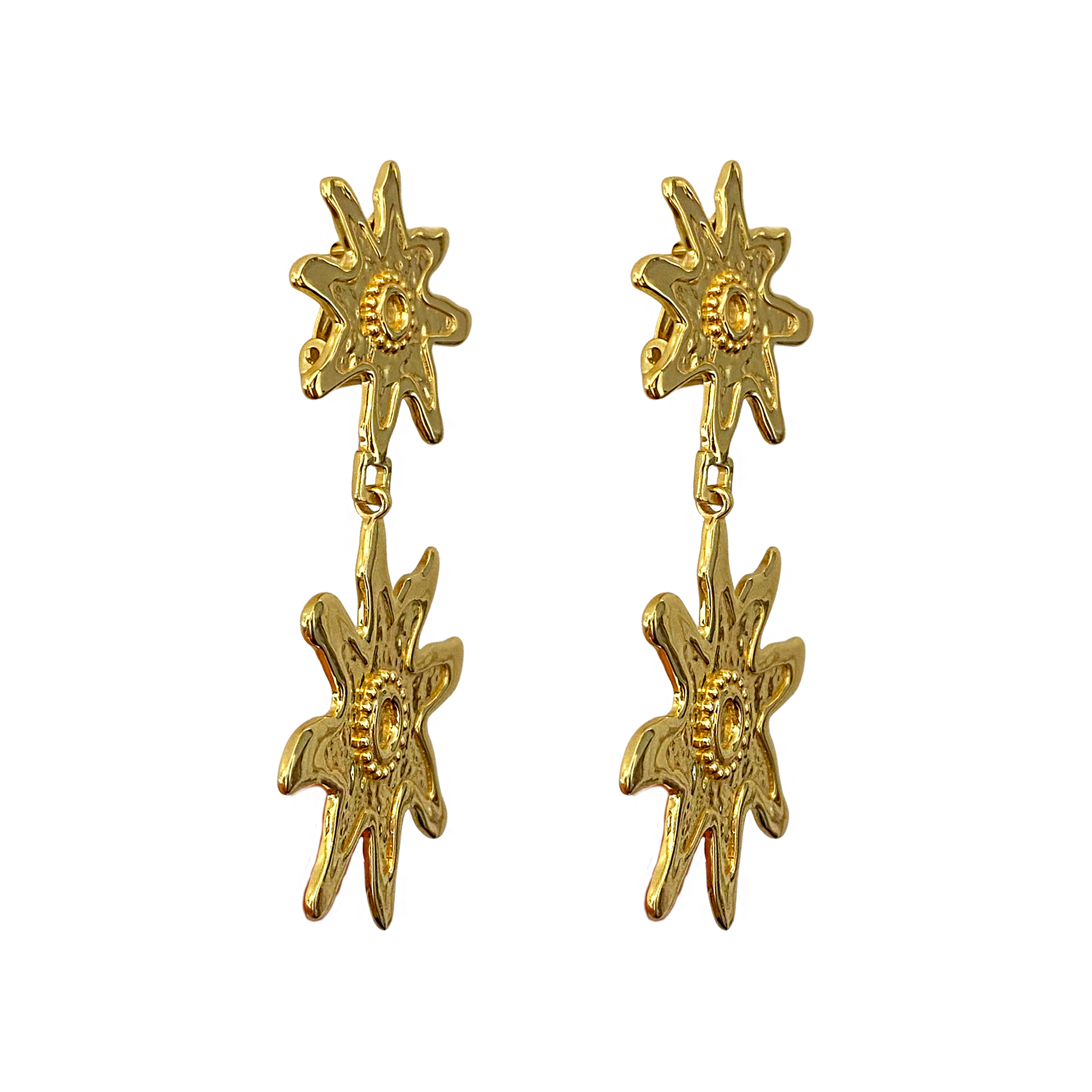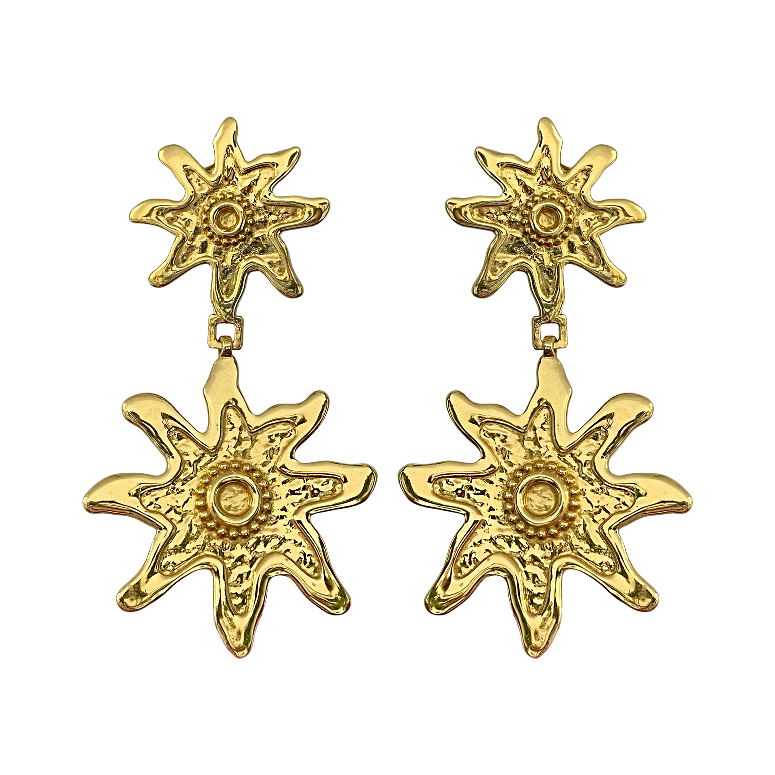 The Mirabella Earrings are the perfect choice for the honeys looking for iconic luxury in their accessories whilst standing out in the crowd. Featuring a gold double star motif in our signature hammered texture juxtaposed with high polish details, they make a statement while remaining timeless. Add a very fabulous touch to your look with the stunning Mirabella Earrings, a highlight from the Primadonna Collection.