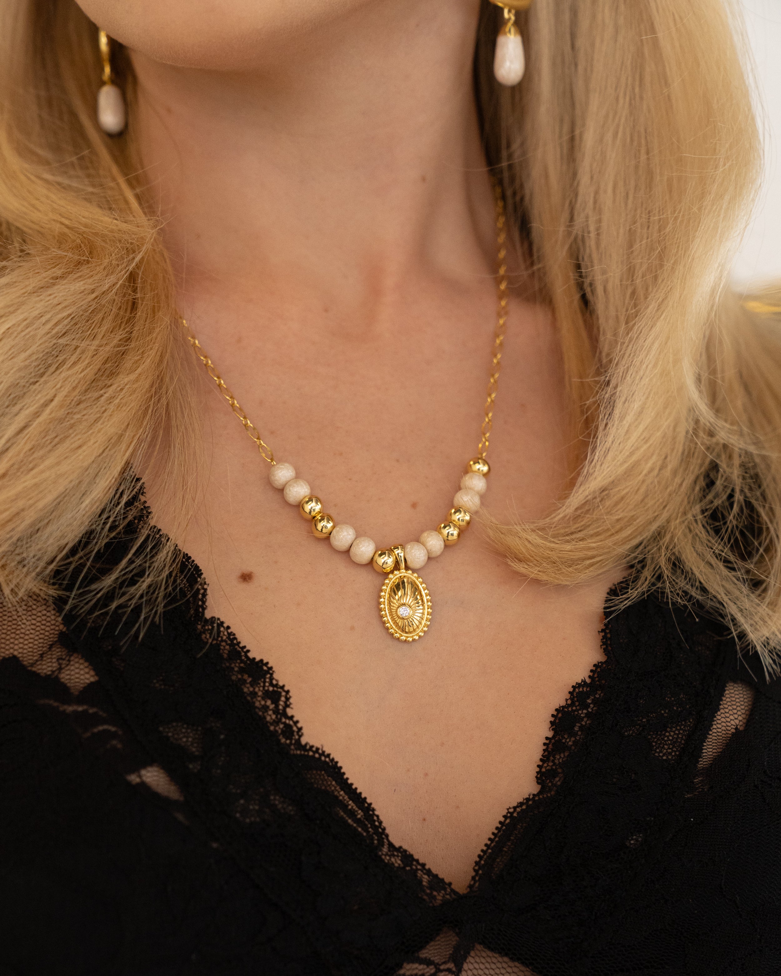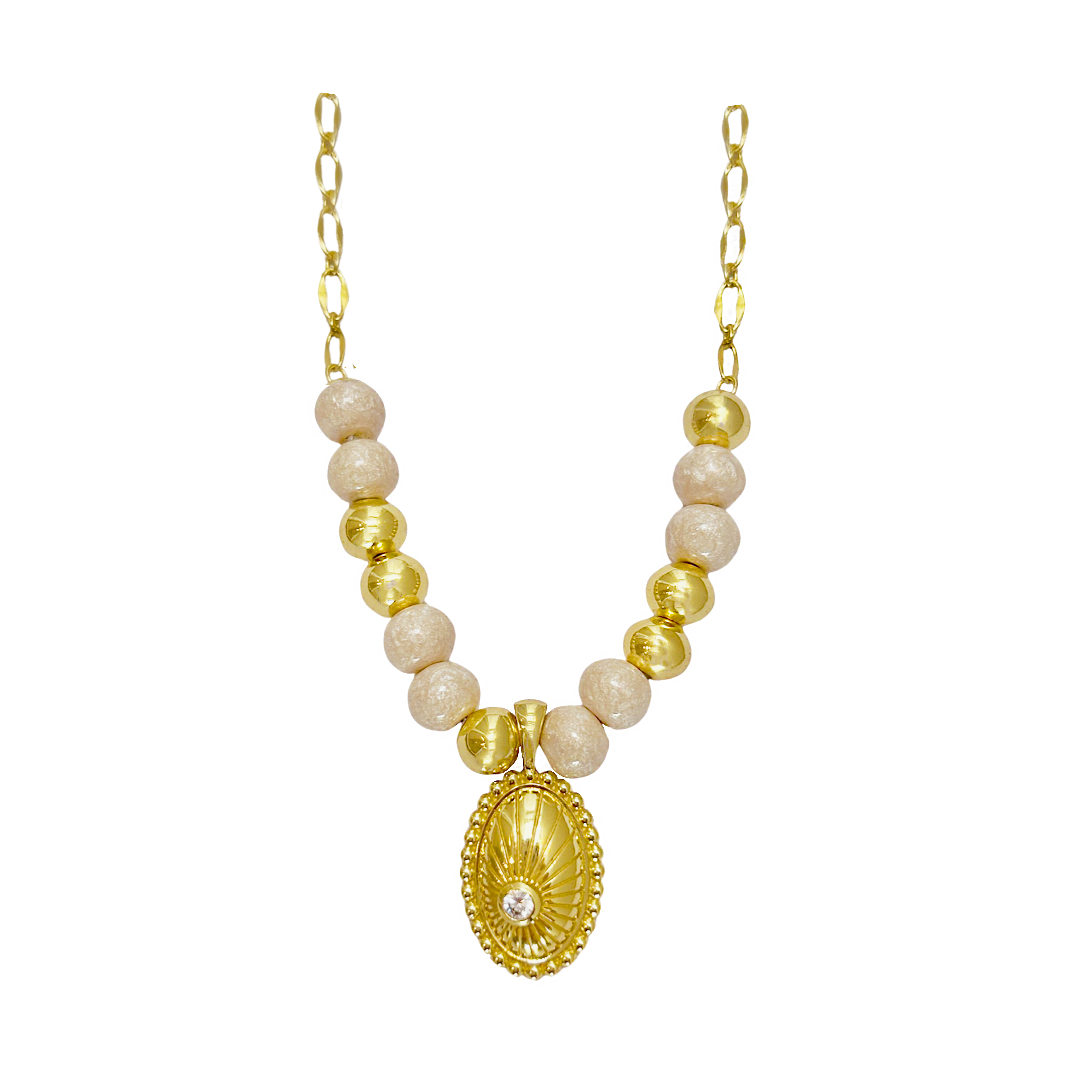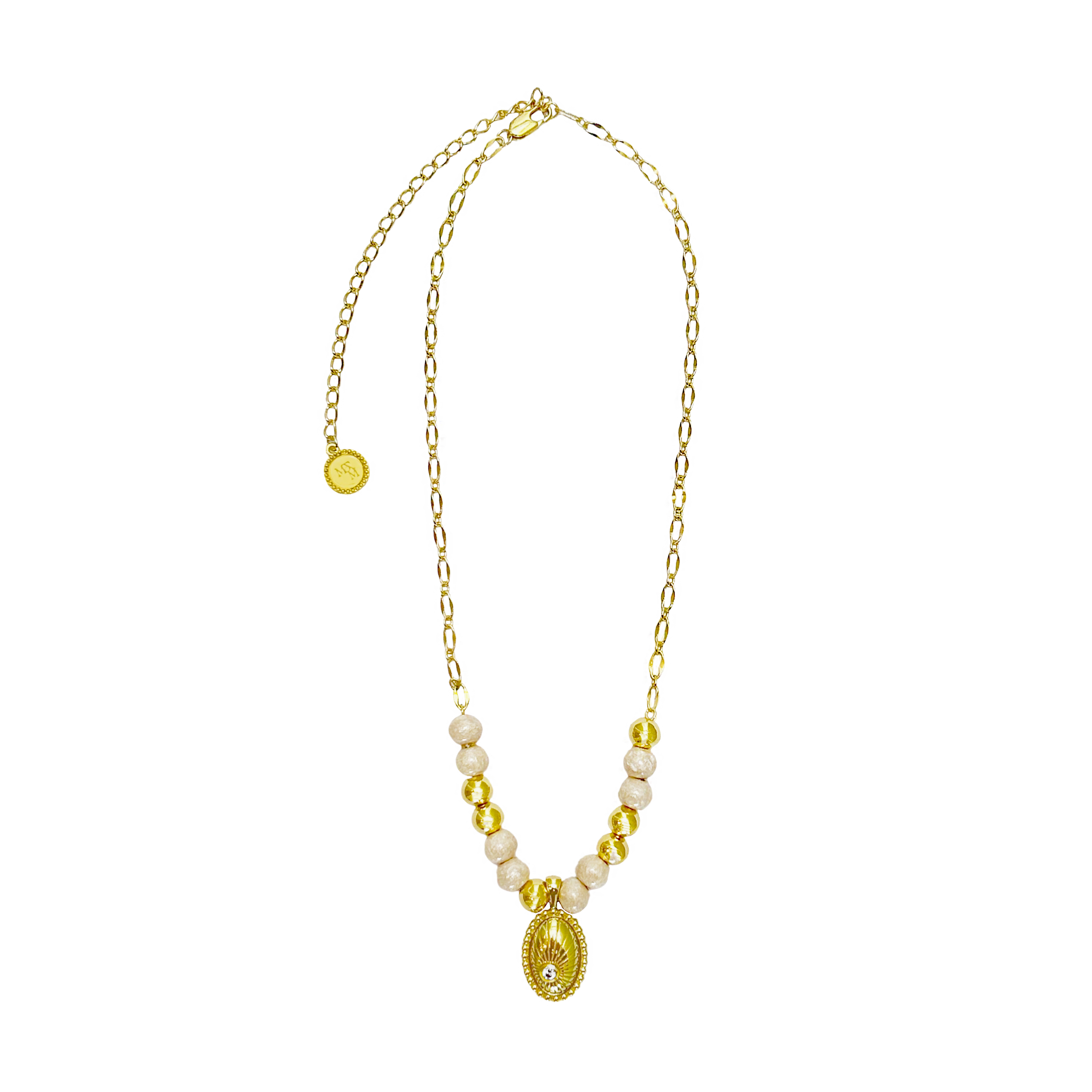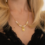 Say hello to the Ophelia Necklace! She's all about romance, embodying vintage glamour in the most fabulous way...in true MM style!  From day to night, she'll make you feel feminine and oh-so-fabulous. Featuring a stunning locket-style pendant adorned with a faceted White CZ gemstone, she's surrounded by pearly enamel and golden beads. Ophelia is a striking beauty on her own, but also perfect for layering. Don't be surprised if you never want to take her off!