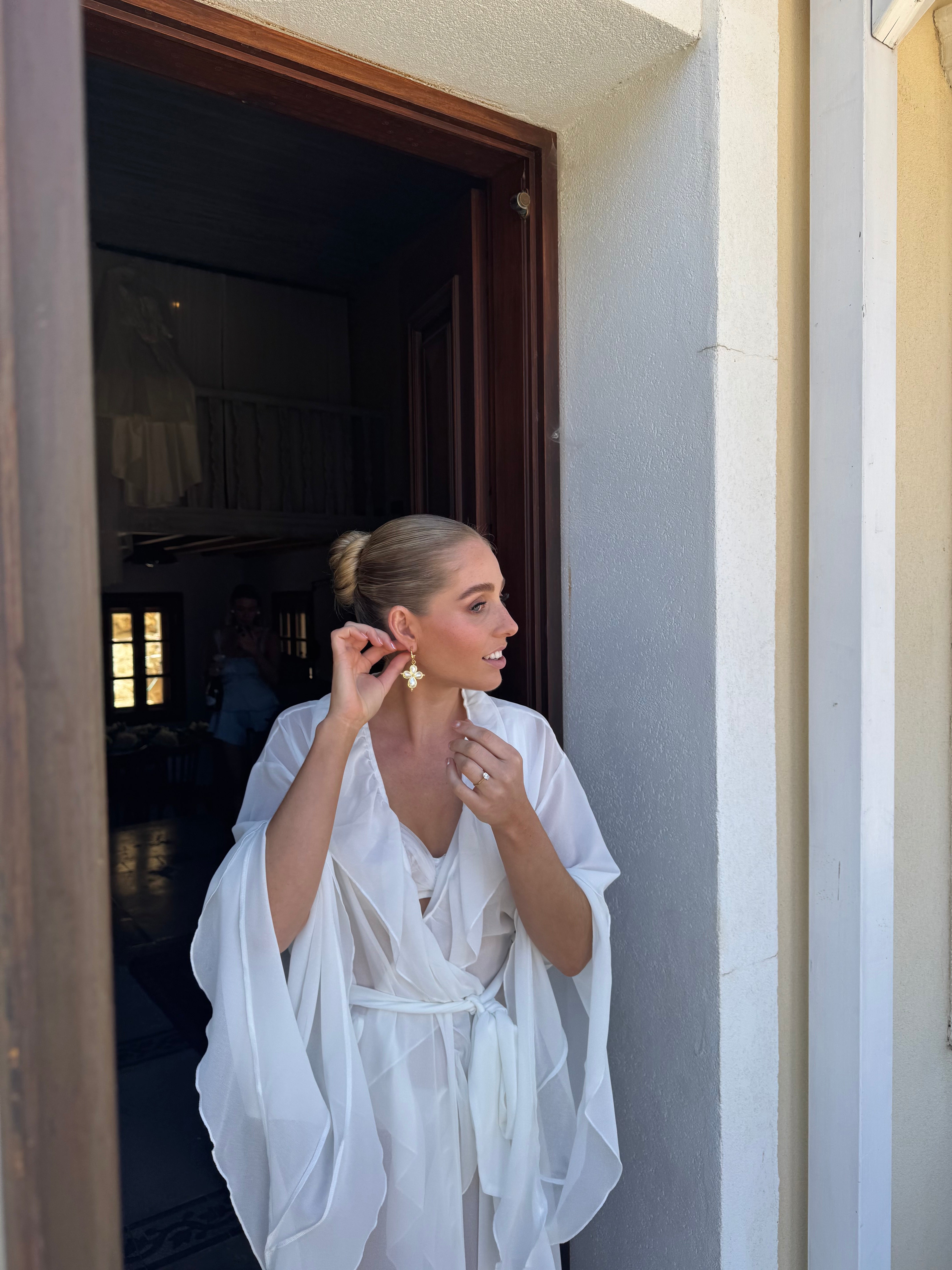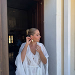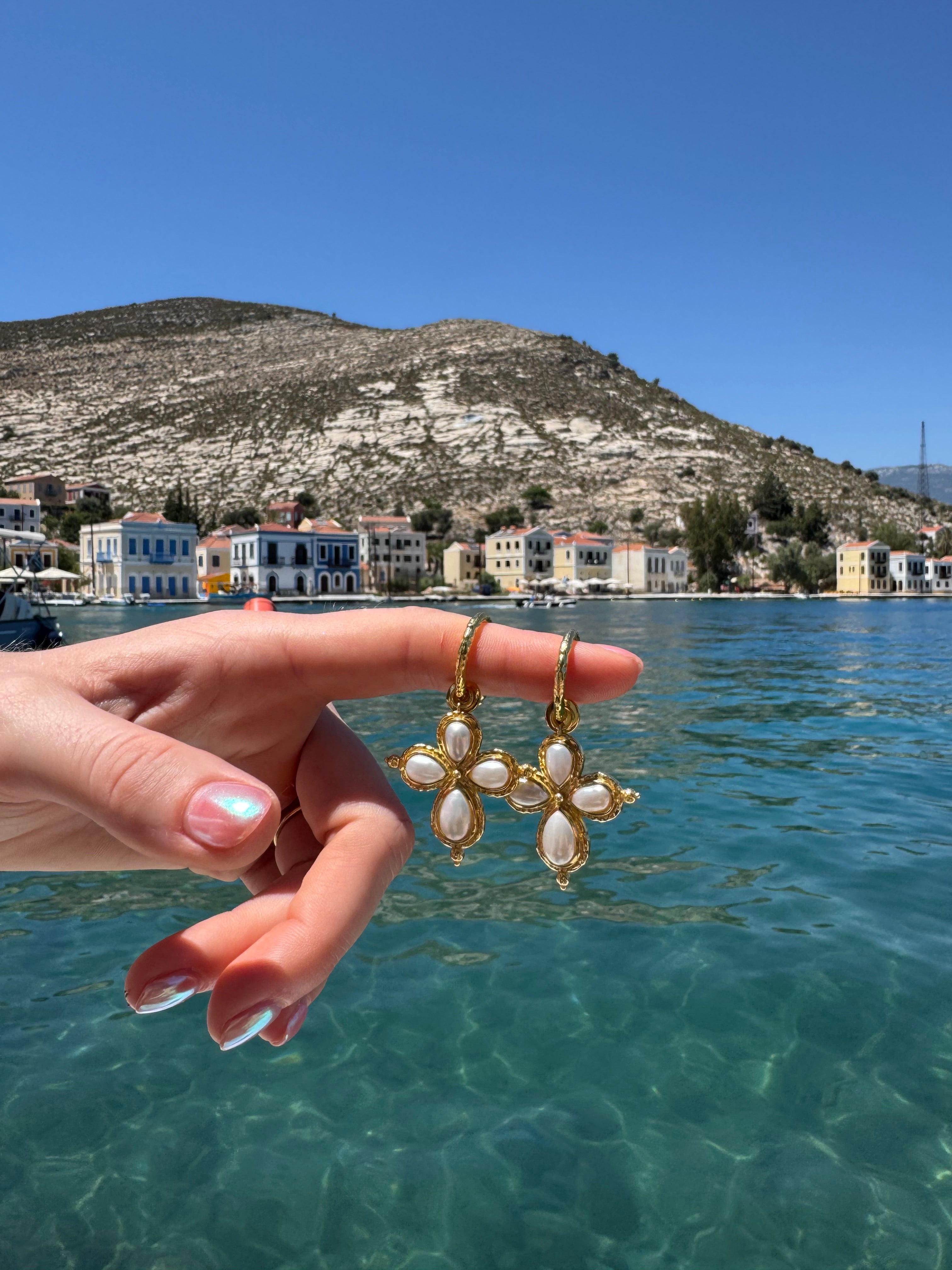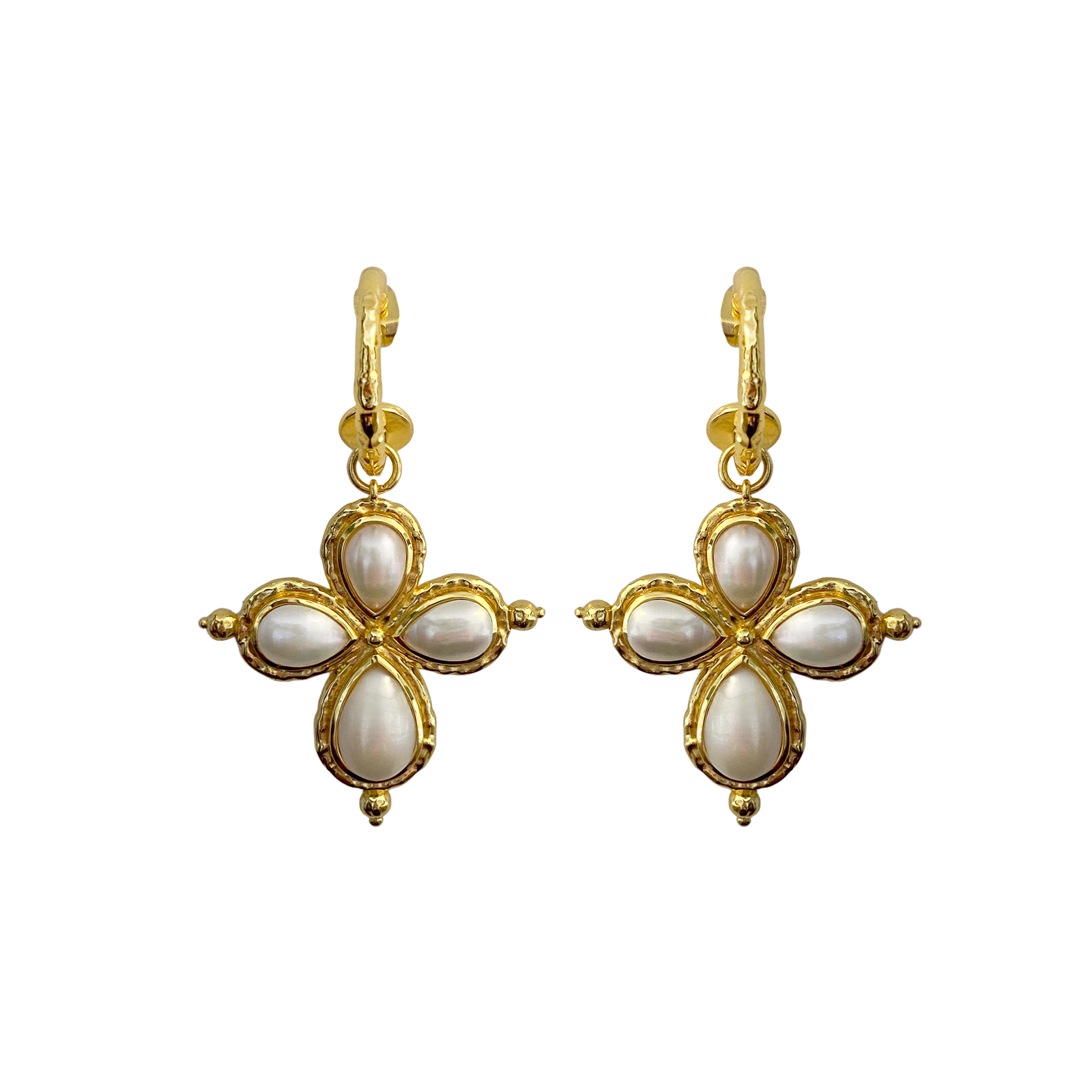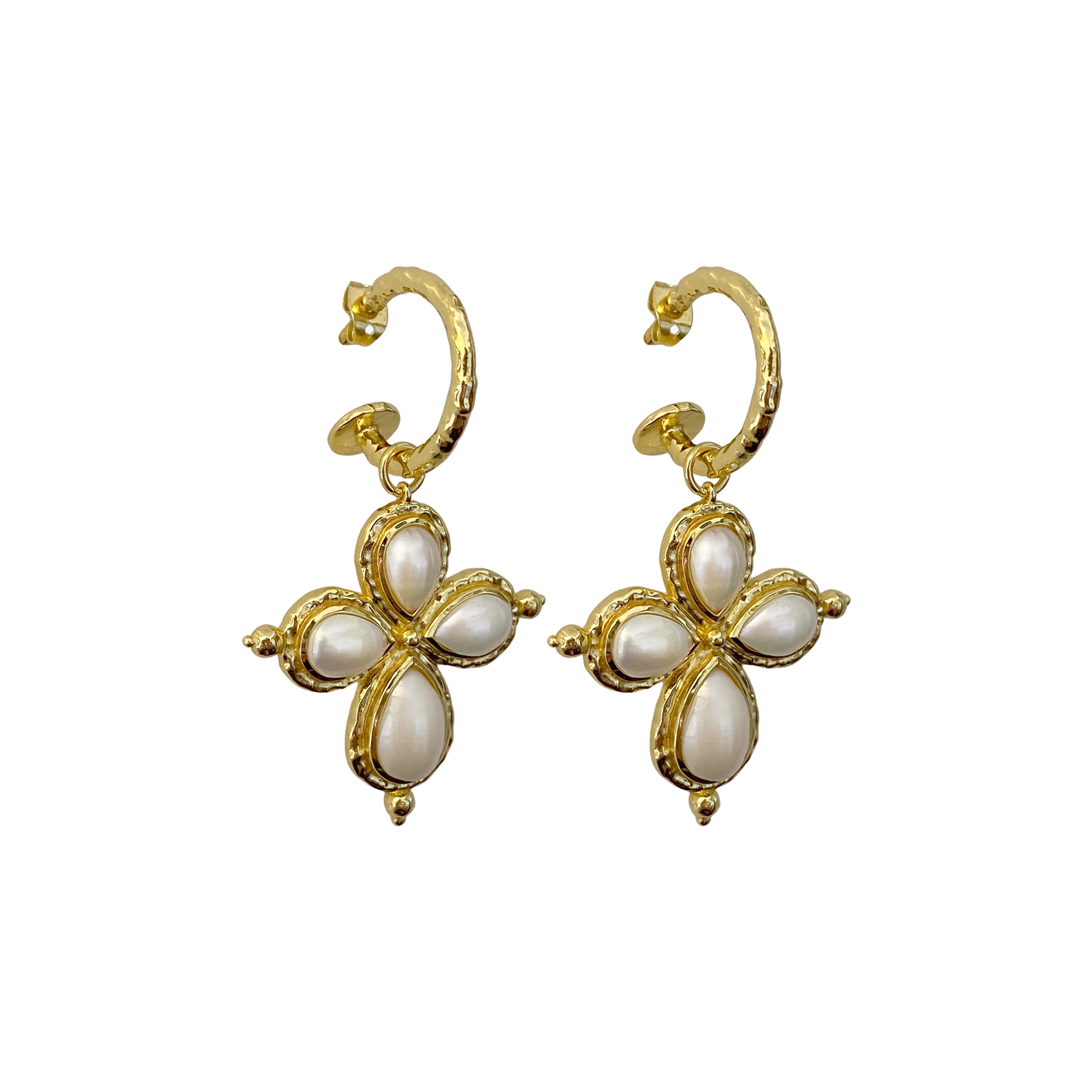 The Rosalia Earrings are an instant classic, destined to become a cult MM favourite, we are head over heels in love! Crafted with classic glass pearls, they feature a romantic, baroque-inspired cross style, and chic hammered gold hoop. A timeless icon, these earrings offer a luxe look that will never go out of style. Elevate your everyday and give a luxe and timeless feel to every look. With meticulous craftsmanship and attention to detail, the Rosalia Earrings will become your go-to for effortless elegance.