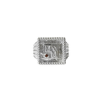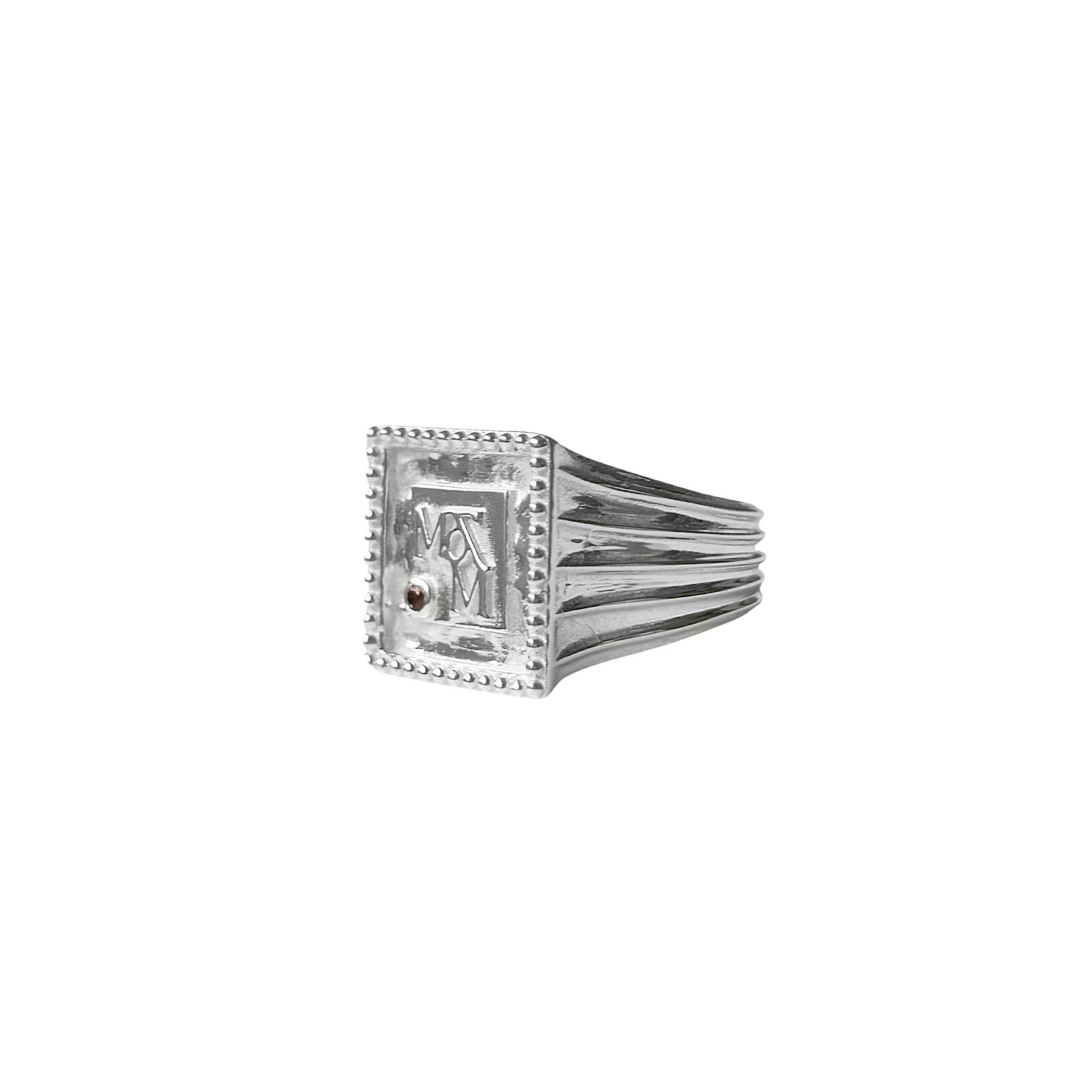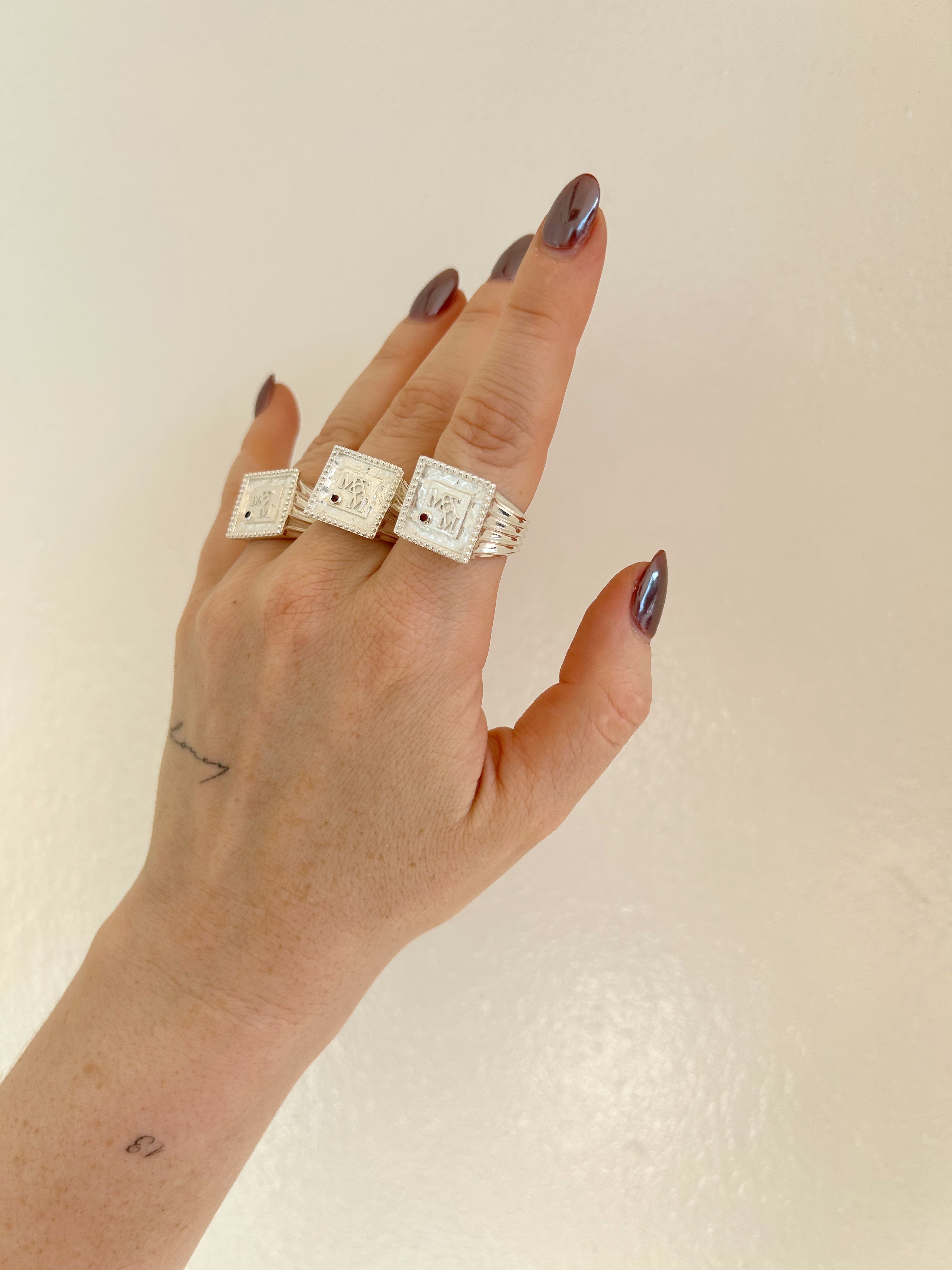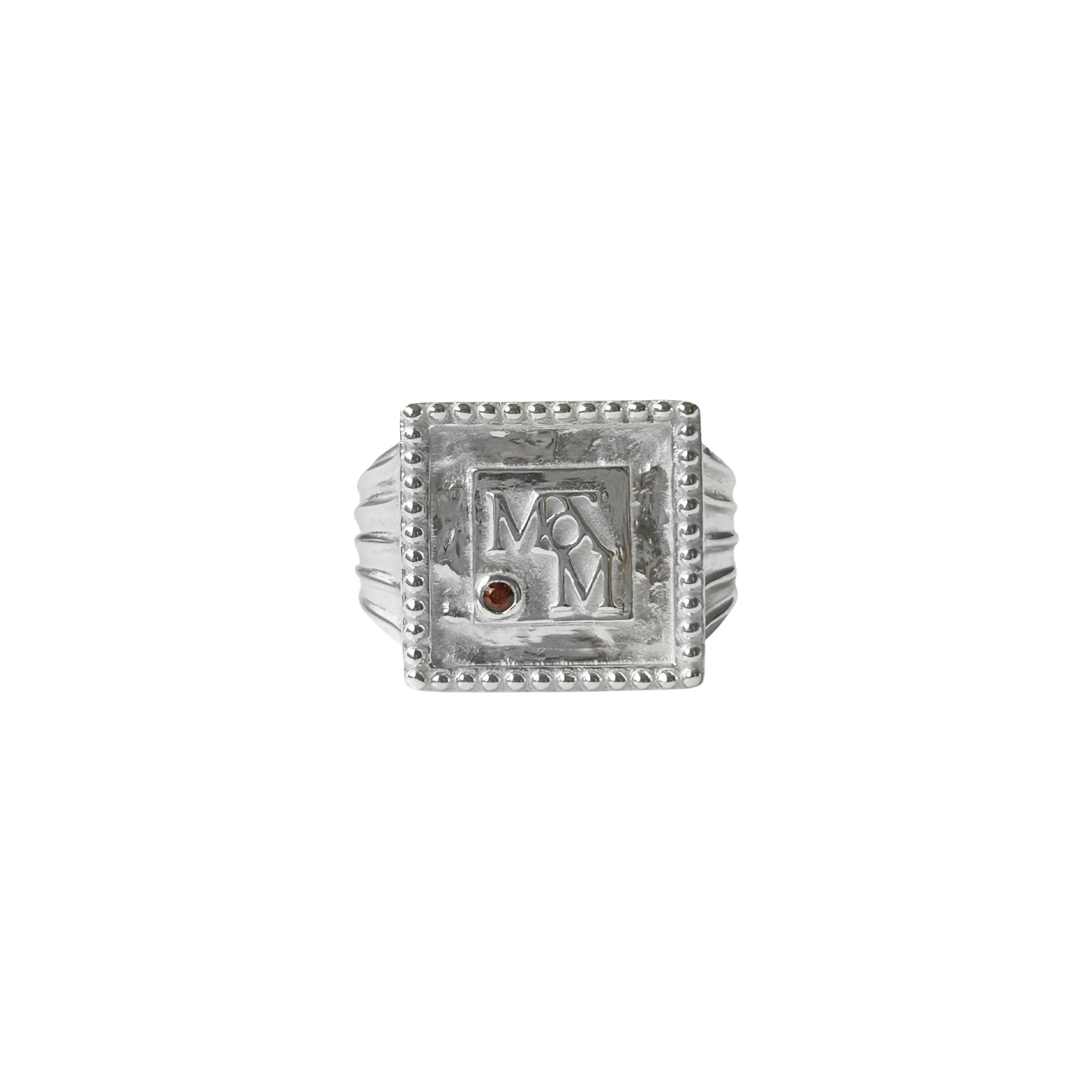 Our MM Signet is a special piece. Now in her silver ear... An iconic signet style ring taken to the next level with our signature rava ball design and the MM logo shining bright in the centre with an inset garnet. Up the WOW factor on your ring party with this bold and beautiful design that is sure to send compliments your way!