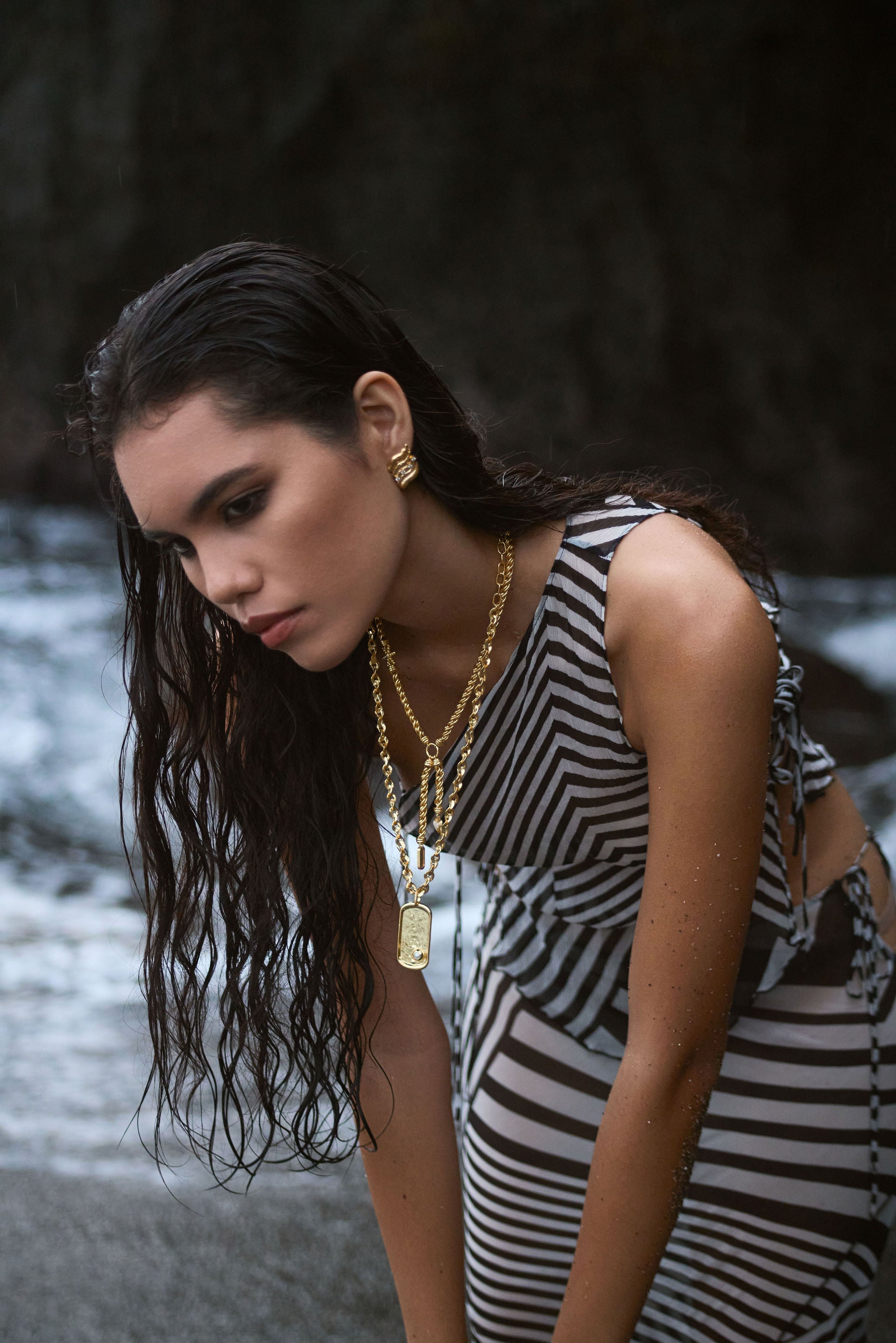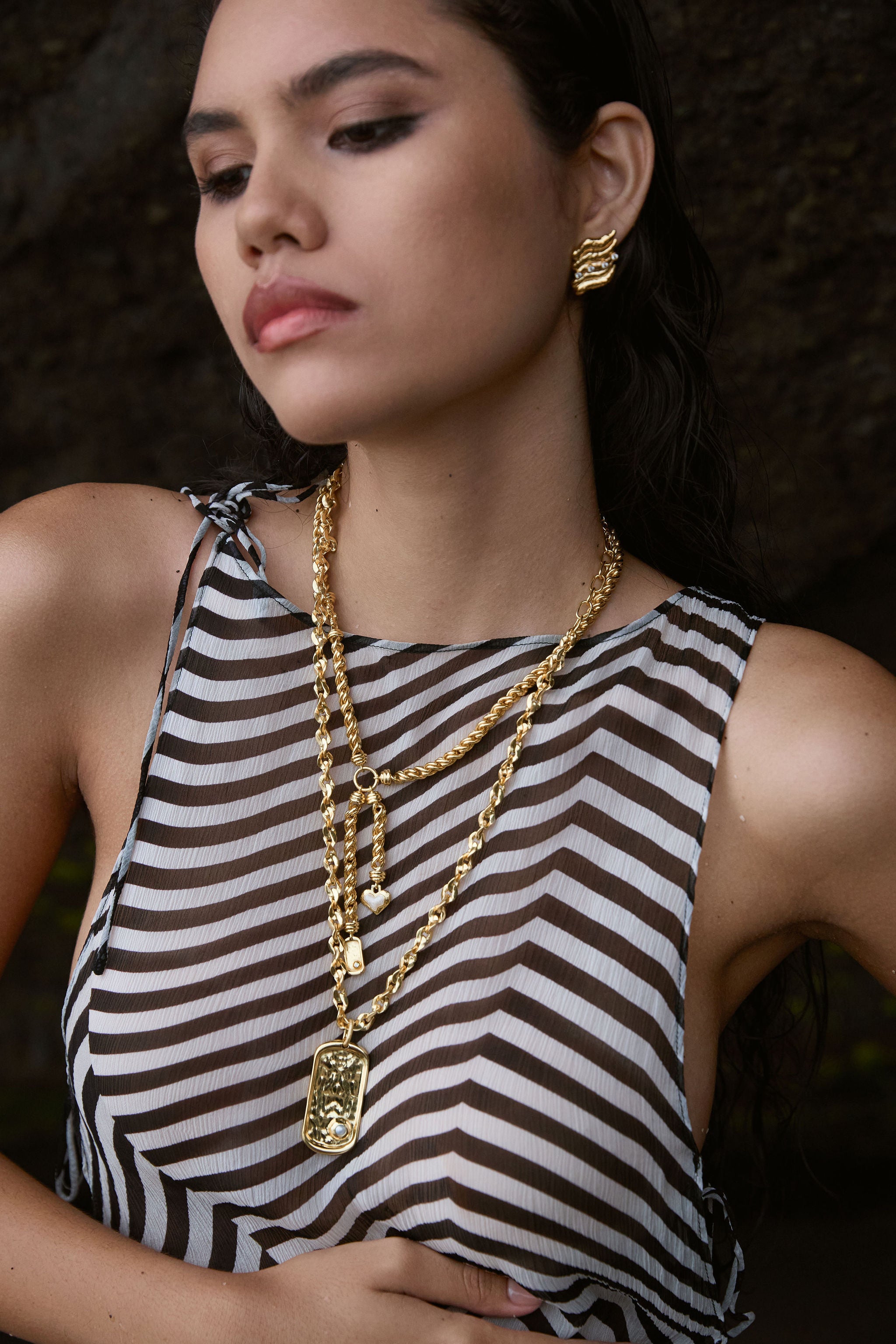 Part of the Sirens Collection, Cassia celebrates storytelling through symbolism. The star evokes guidance and celestial beauty; the heart speaks to love and devotion; the dog tag adds a contemporary edge—together forming a wearable narrative of identity, emotion, and adventure. The rich gold finish and soft enamel details feel like sunlit treasures rediscovered on Mediterranean shores.