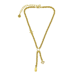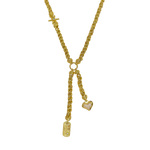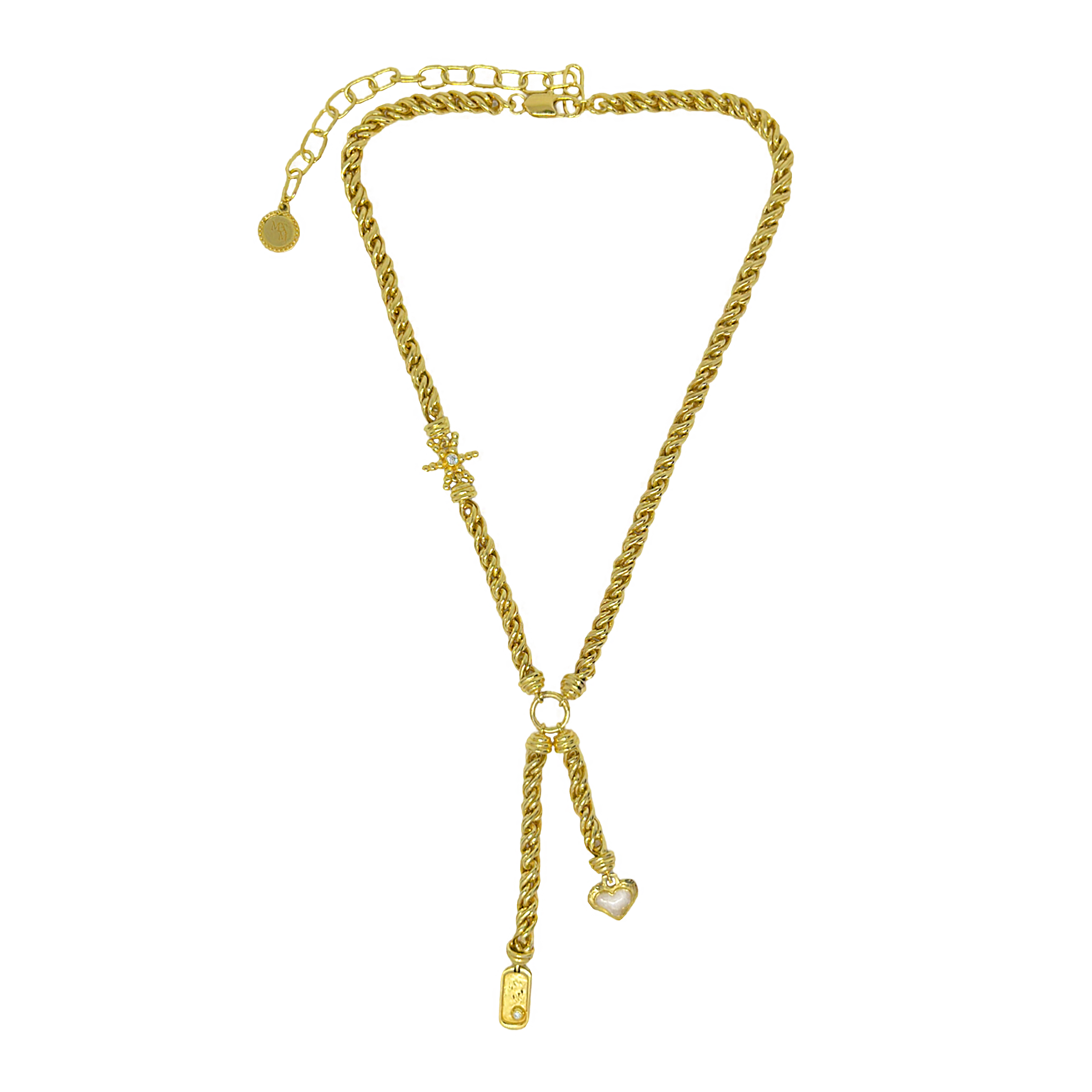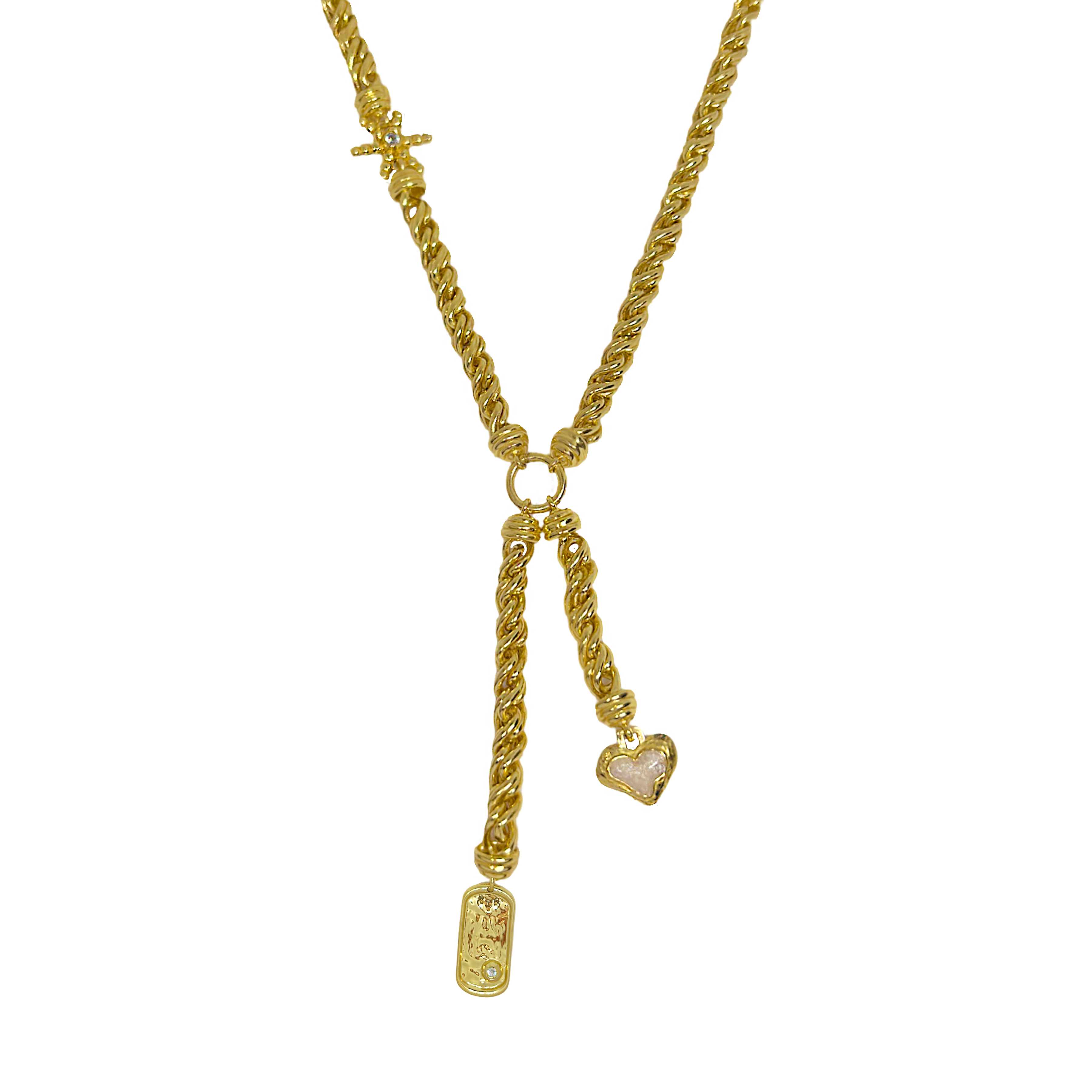 Playful yet powerful, the Cassia Necklace is a bold expression of modern mythology. Designed in a lariat style with a textured, rope-like gold chain, this statement piece features three symbolic charms—star, heart, and dog tag—each suspended at asymmetrical lengths and detailed with pearl enamel accents.