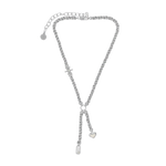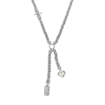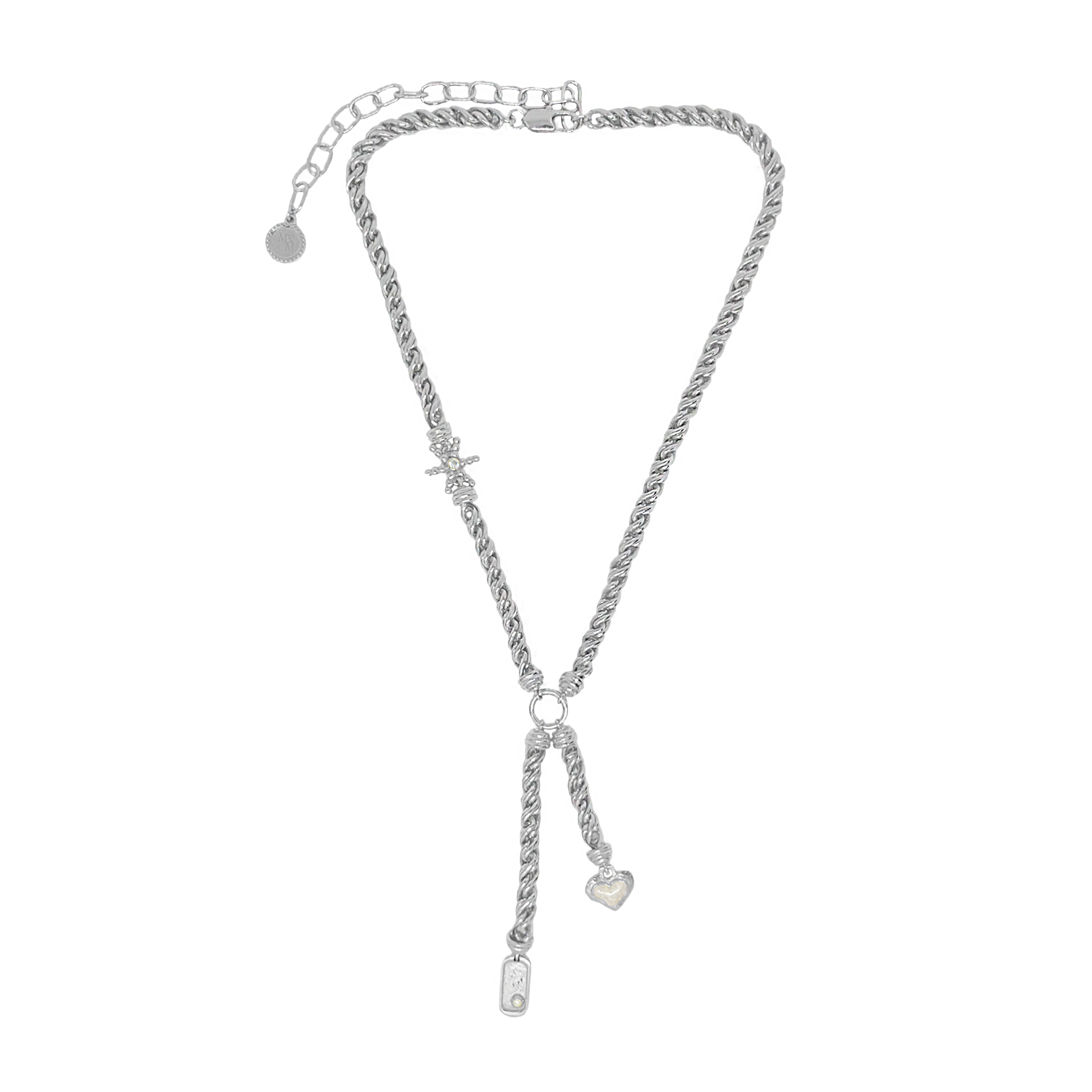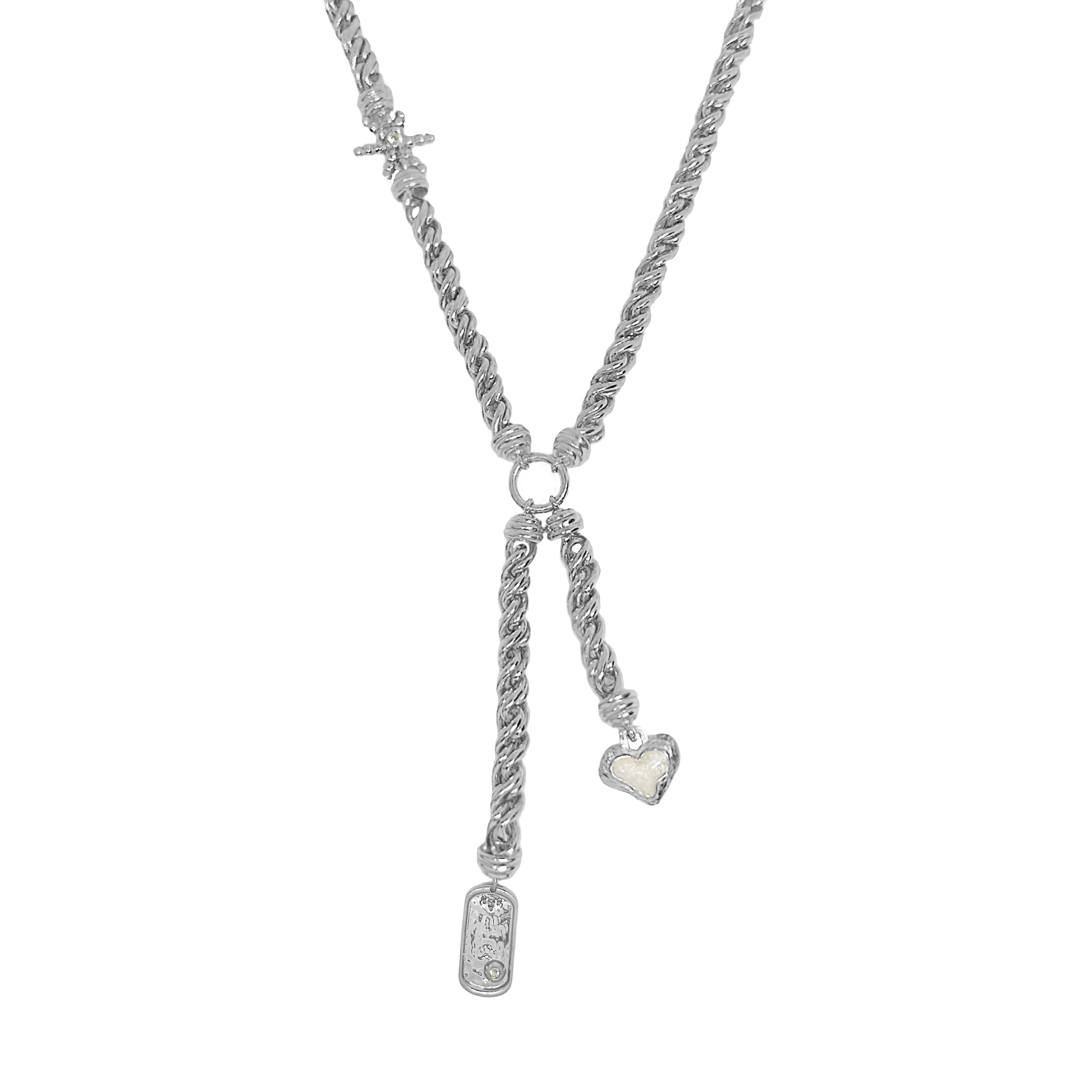 Striking and symbolic, the Cassia Necklace in silver reimagines classic charms through a contemporary lens. Featuring a lariat silhouette with a thick, twisted rope-style chain, it’s finished with three delicately detailed motifs—star, heart, and dog tag—each hanging at asymmetric lengths and accented with luminous pearl enamel.