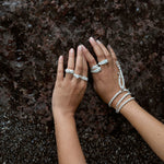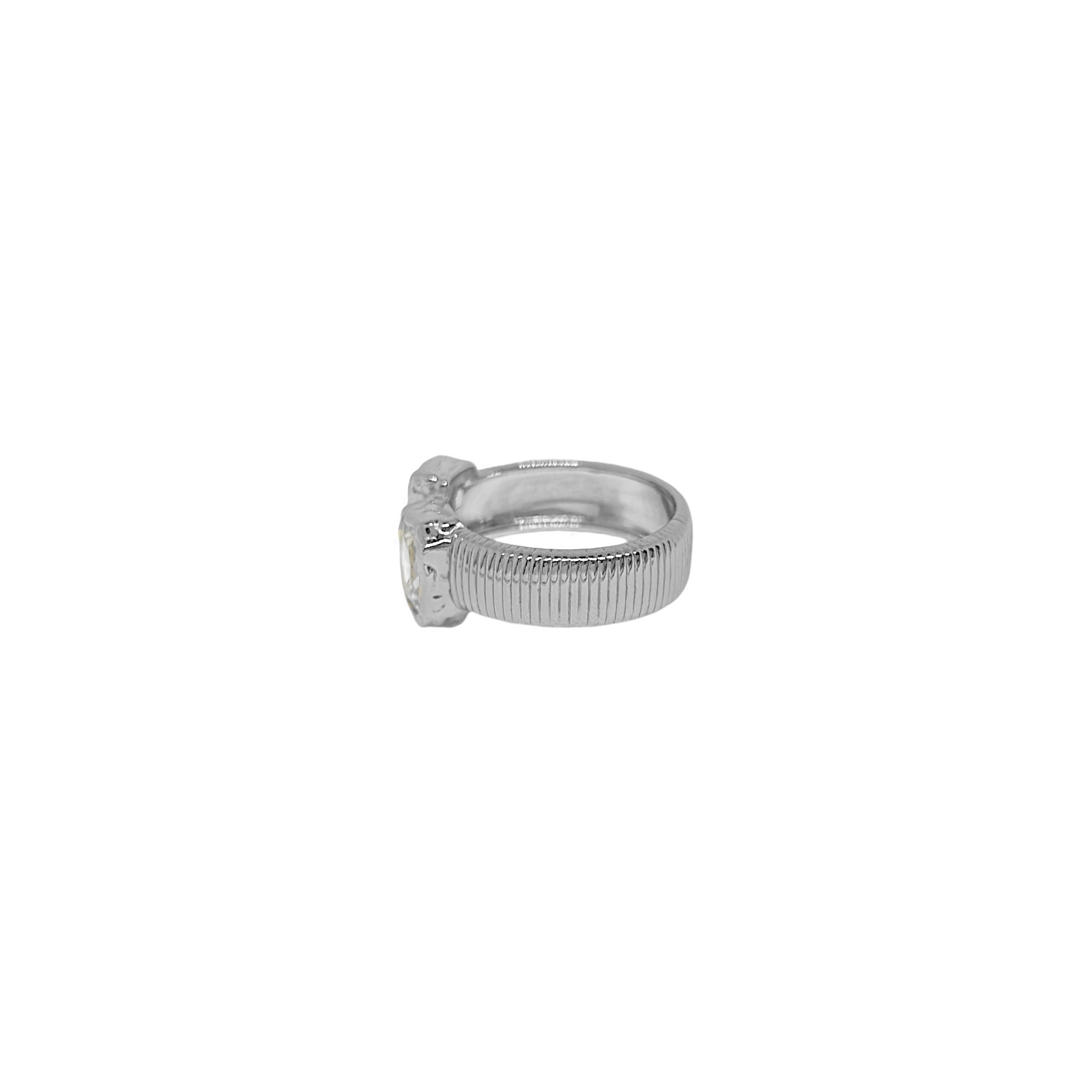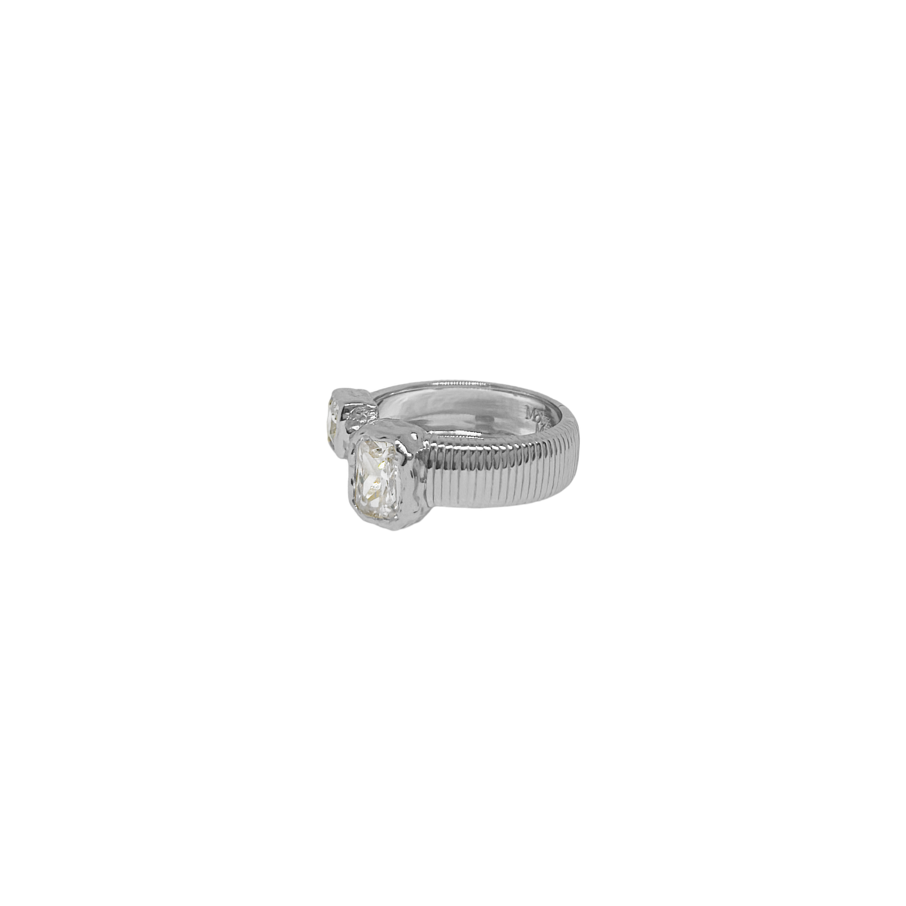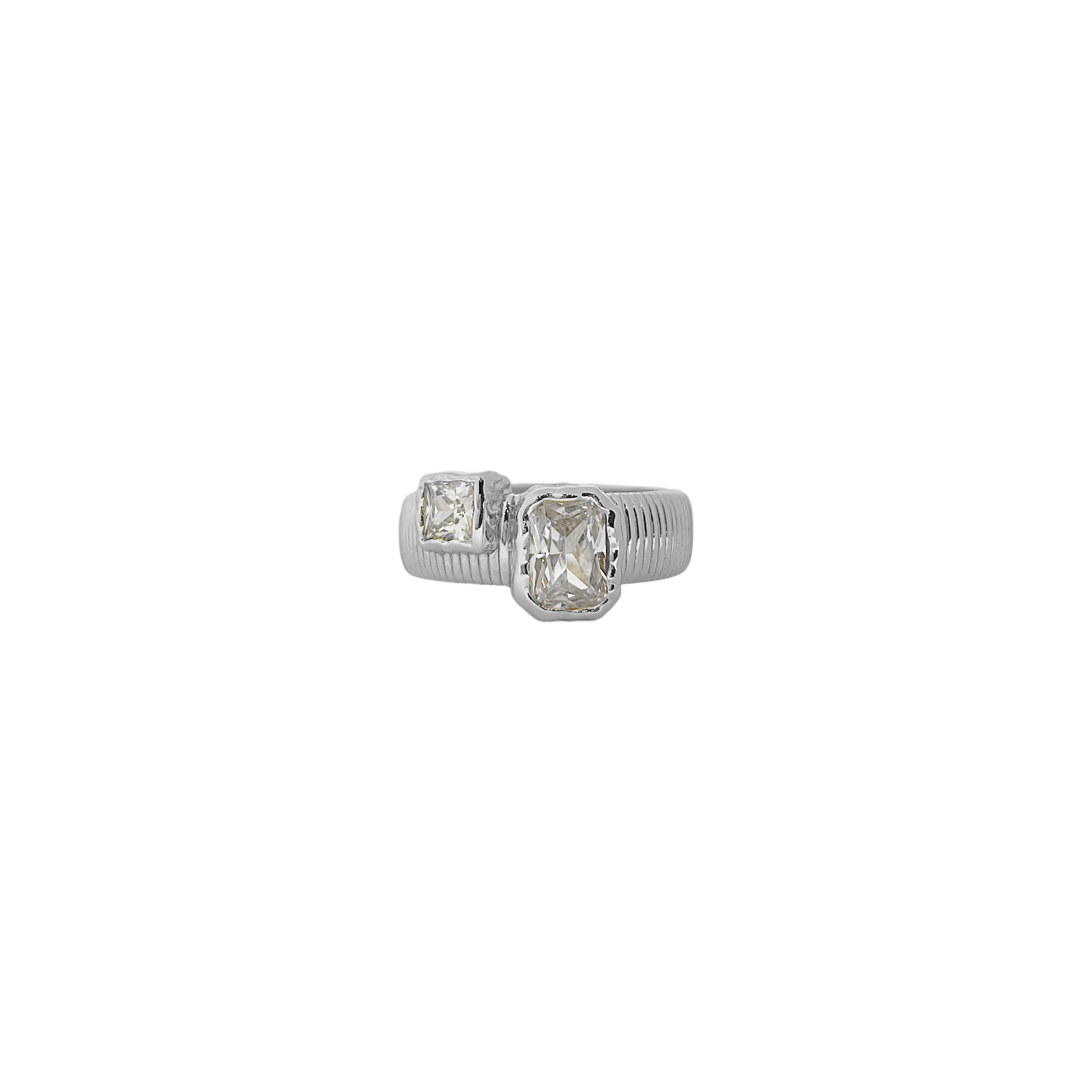 Sculptural and serene, the Maia Ring in silver brings together ancient influence and modern clarity. Its ribbed circular band is crafted in a cool silver-tone finish, framing two rectangular cubic zirconia stones in molten-textured bezel settings—subtle sparkles that evoke the shimmer of starlight on water.