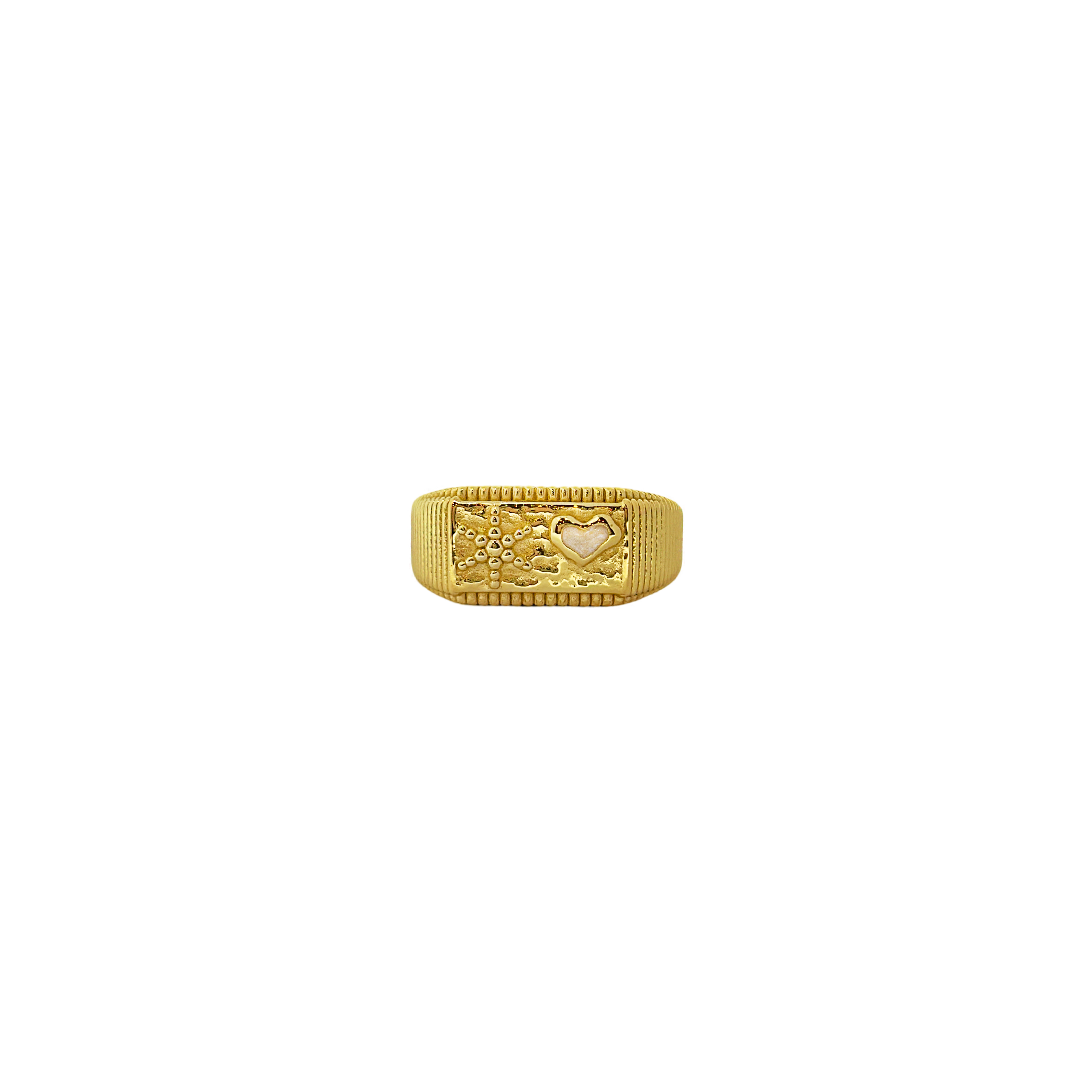 Delicate yet distinctive, the Nika Ring is a reimagined classic—blending the timeless appeal of a signet with the soulful storytelling of the Sirens Collection. Designed with a slim ribbed band and a softly hammered face, it features our signature heart and star motifs, finished with subtle enamel accents for a touch of celestial shine.