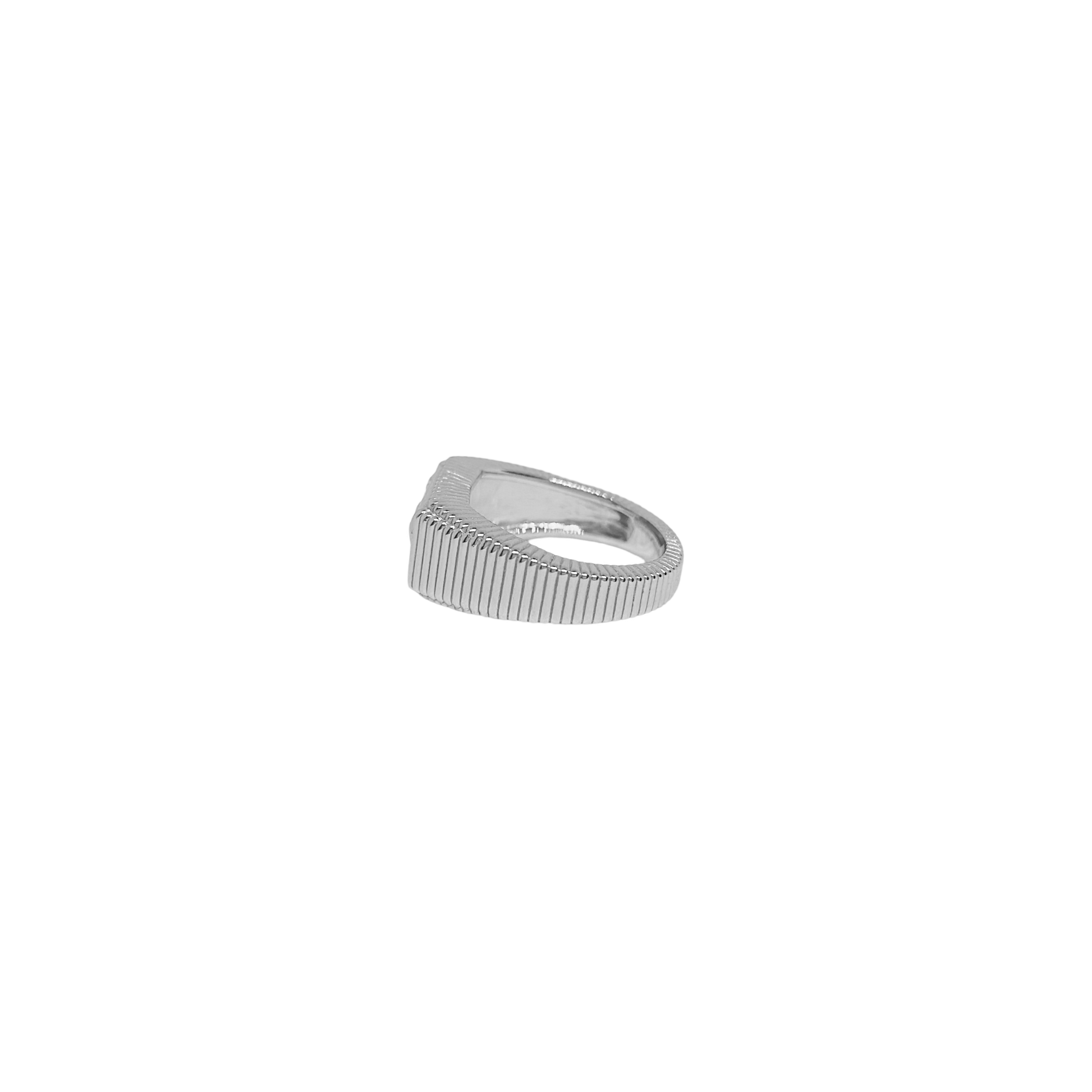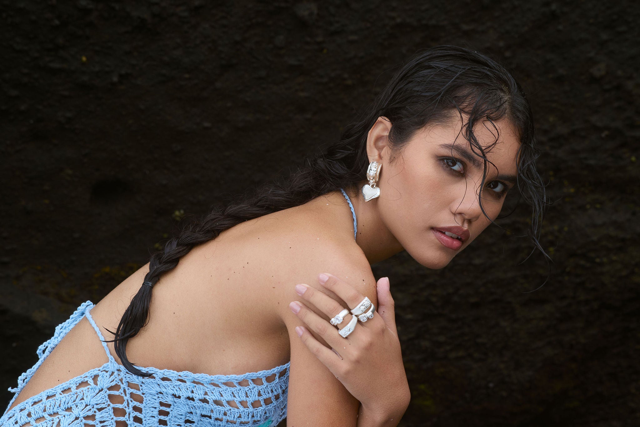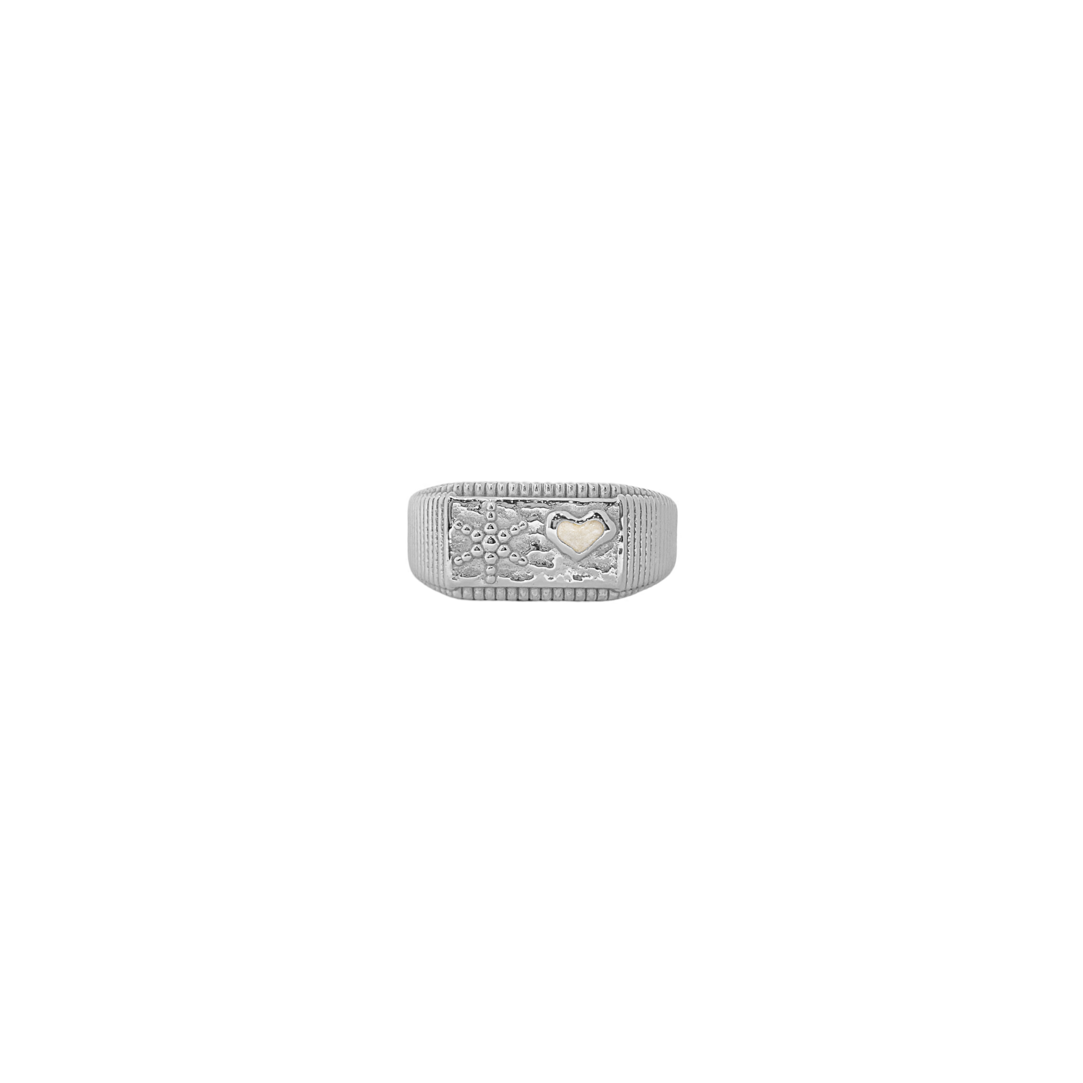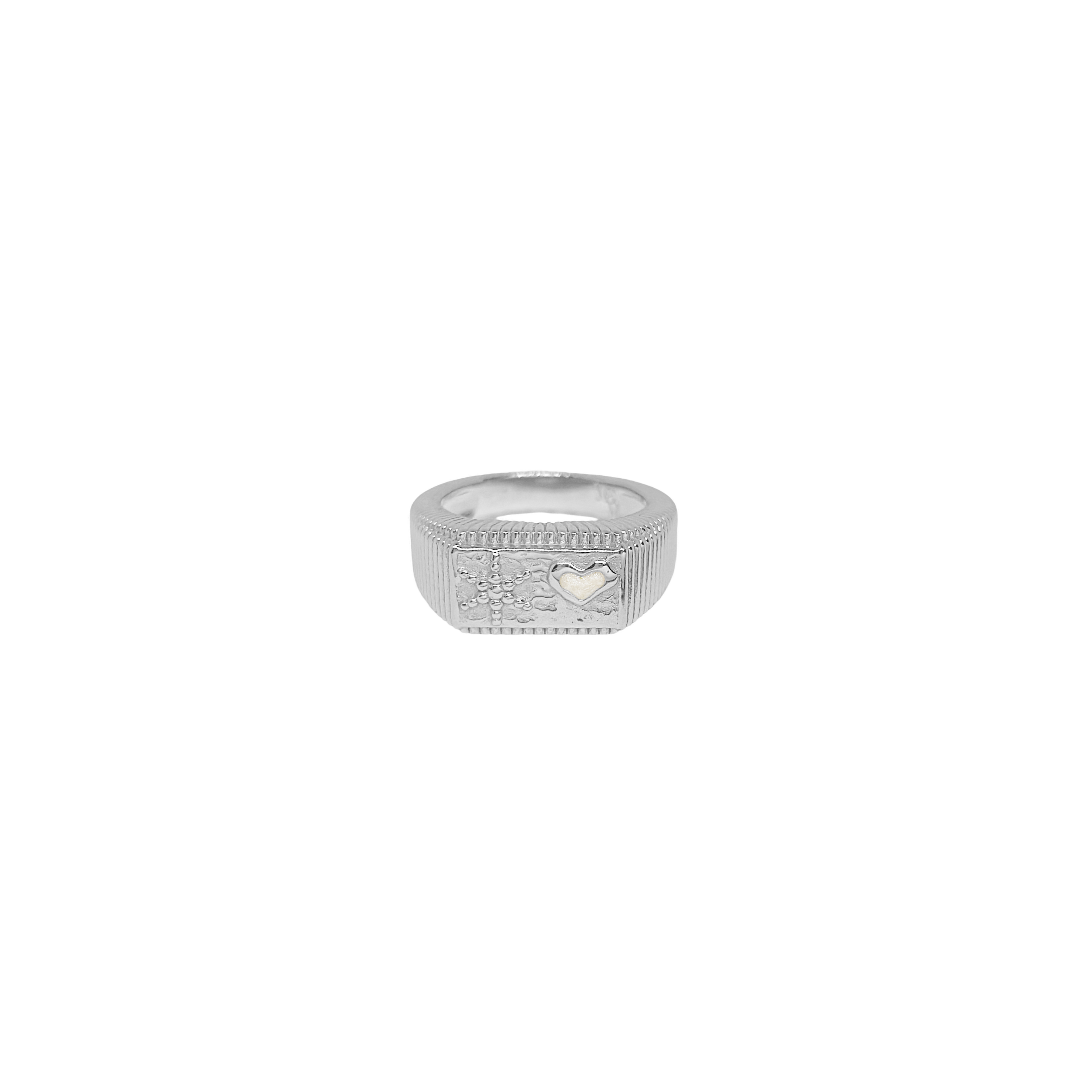 Refined with a hint of rebellion, the Nika Ring in silver offers a modern interpretation of the classic signet. Featuring a slim ribbed band and a softly hammered face, it’s engraved with the Sirens Collection’s signature heart and star motifs—symbols of love and guidance—finished with delicate enamel accents for a subtle glow.