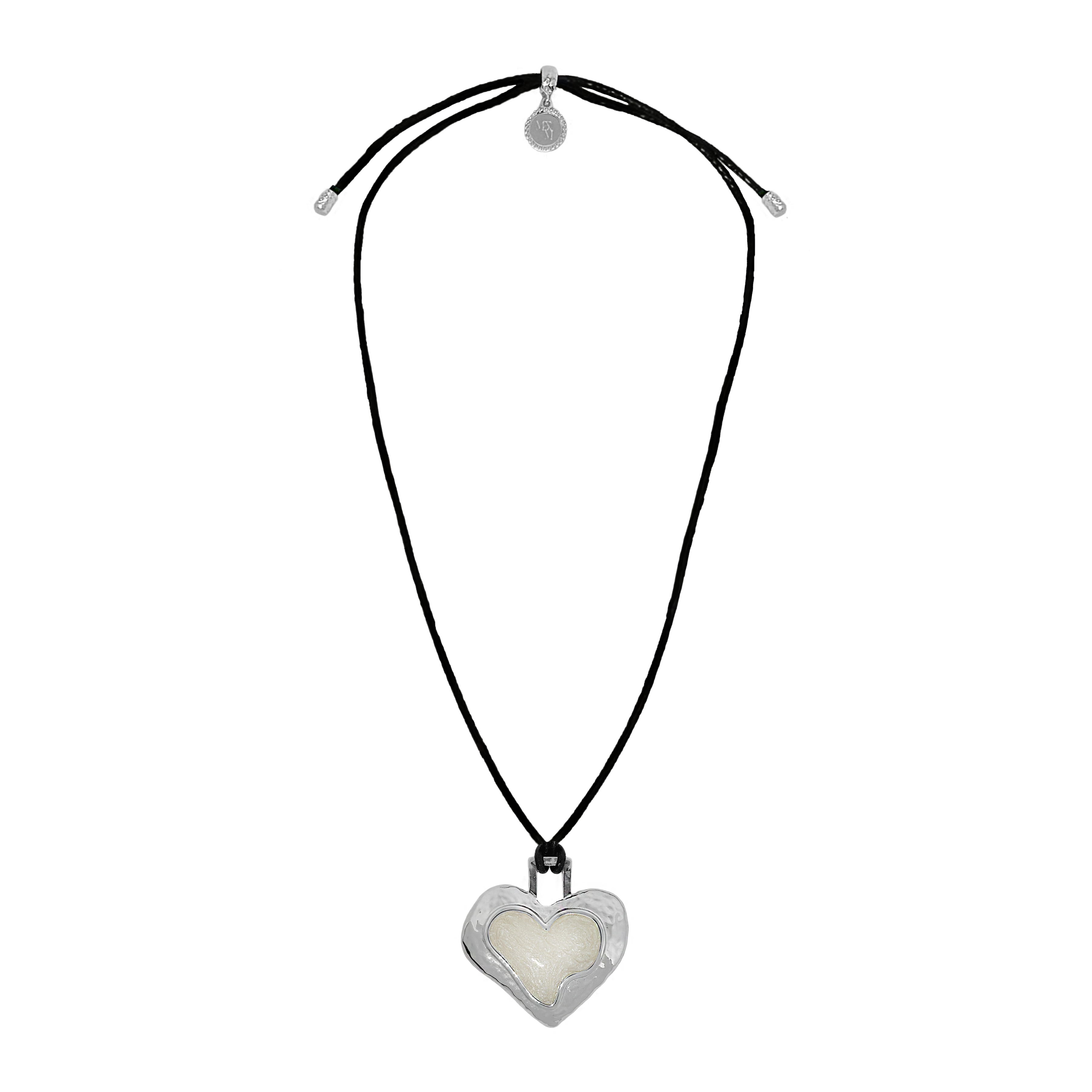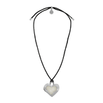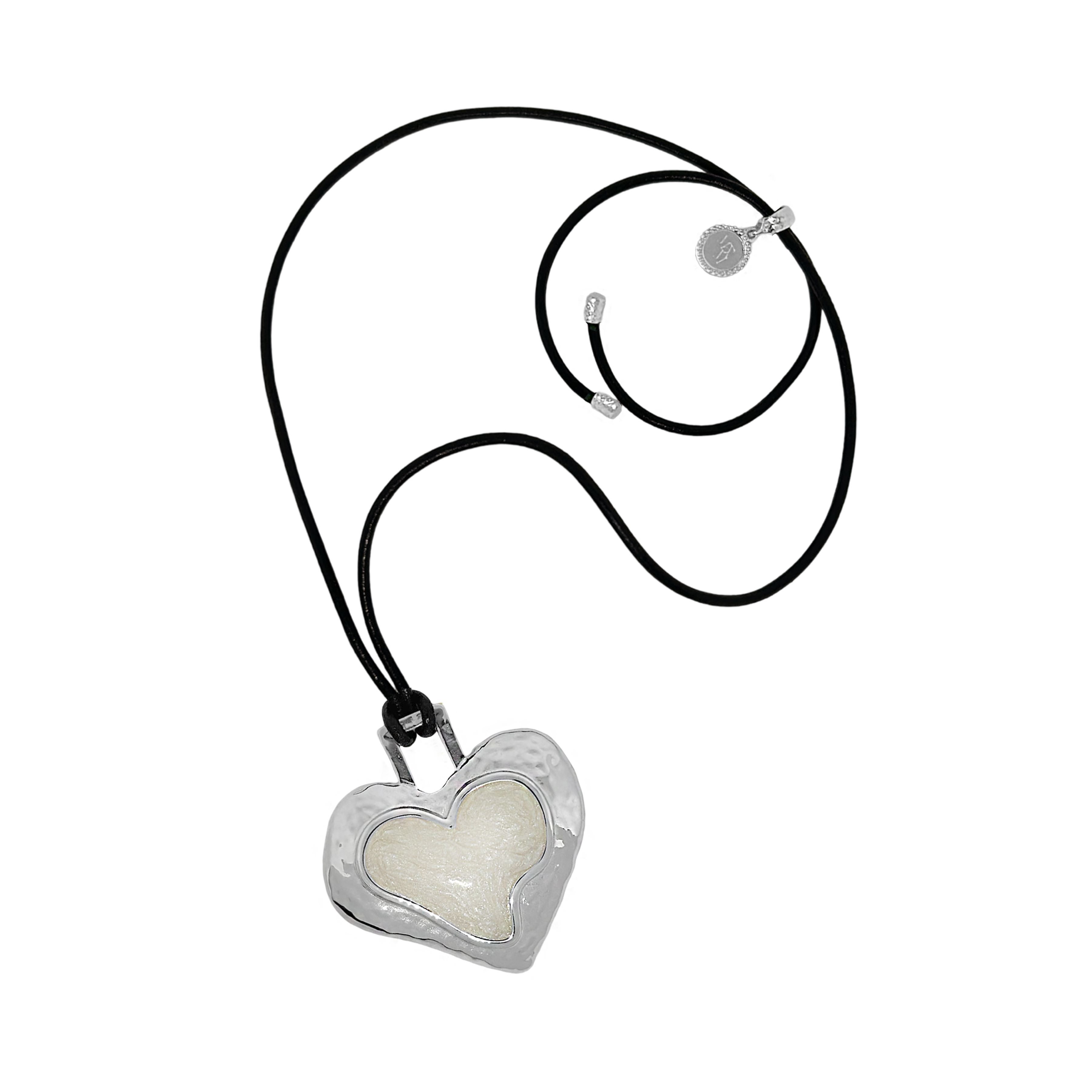 Striking and sentimental, the Olympia Necklace in silver brings together the cool edge of '90s nostalgia with the enduring beauty of Greek mythology. A heart-shaped pendant crafted in molten silver and glowing pearlescent enamel rests effortlessly on a black leather cord—offering a fresh yet timeless take on a beloved classic.