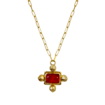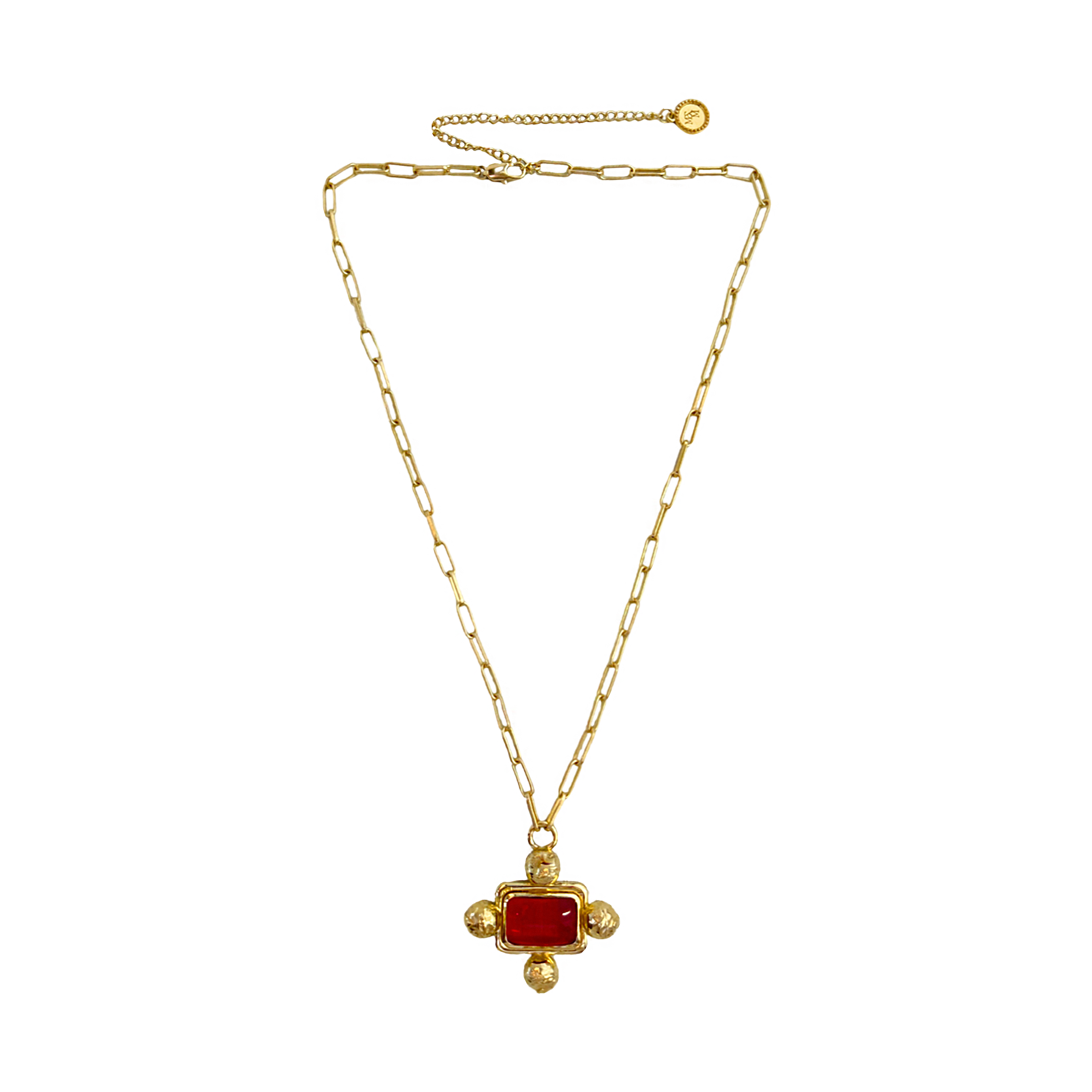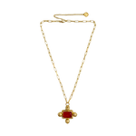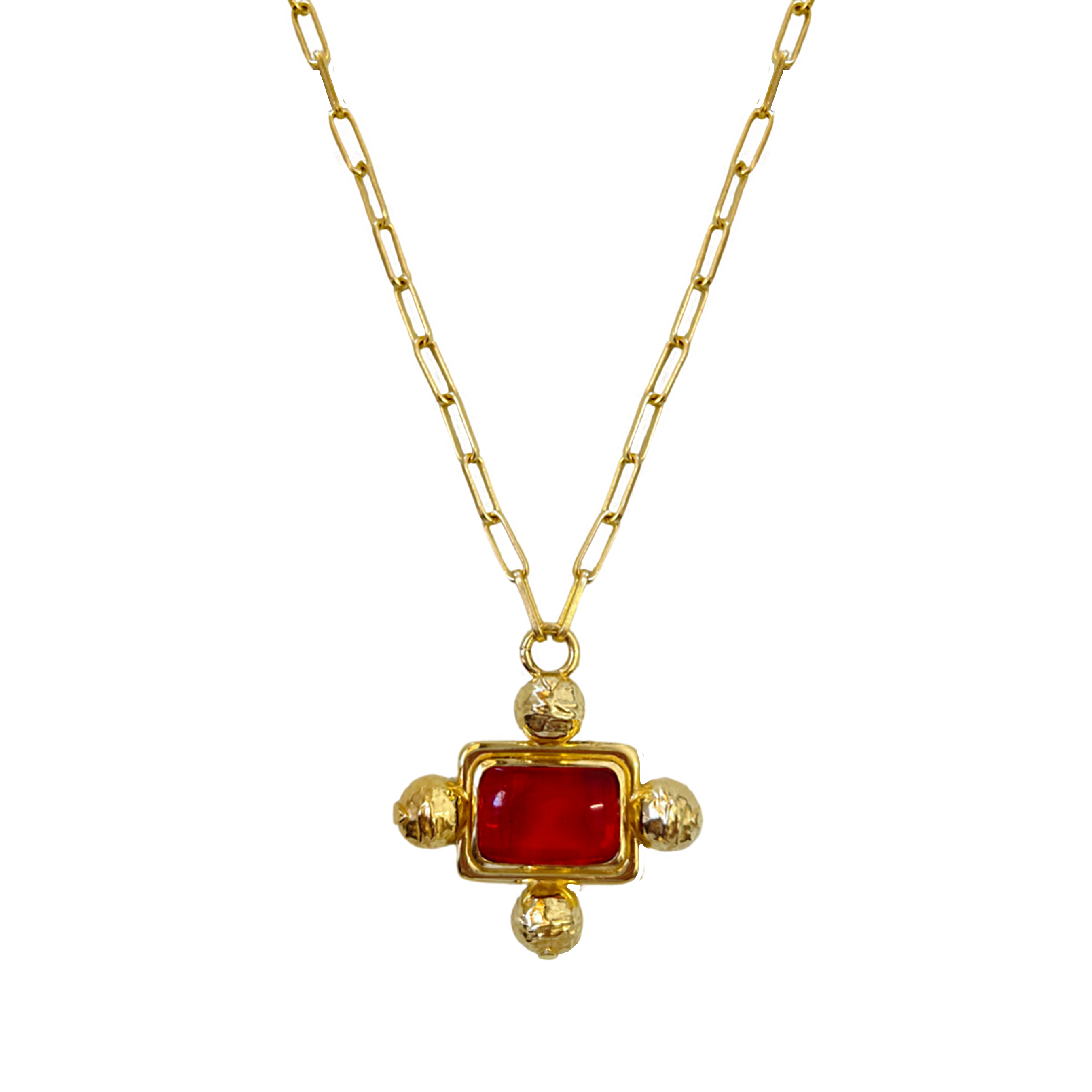 A little commotion for this icon... the YASMEEN Necklace. Inspired by the 90's supermodels who graced our runways, she is beautiful and bold! The Yasmeen was created to elevate and transform any look. A new motif to our collection featuring a chunky setting, our favourite hammered texture & a striking cabochon red glass stone that brings all the drama we love in a statement necklace. She can be worn long or short, each option offering completely different looks, which makes her very versatile.  She is all glamour and will be a forever iconic piece in your jewellery collection.
