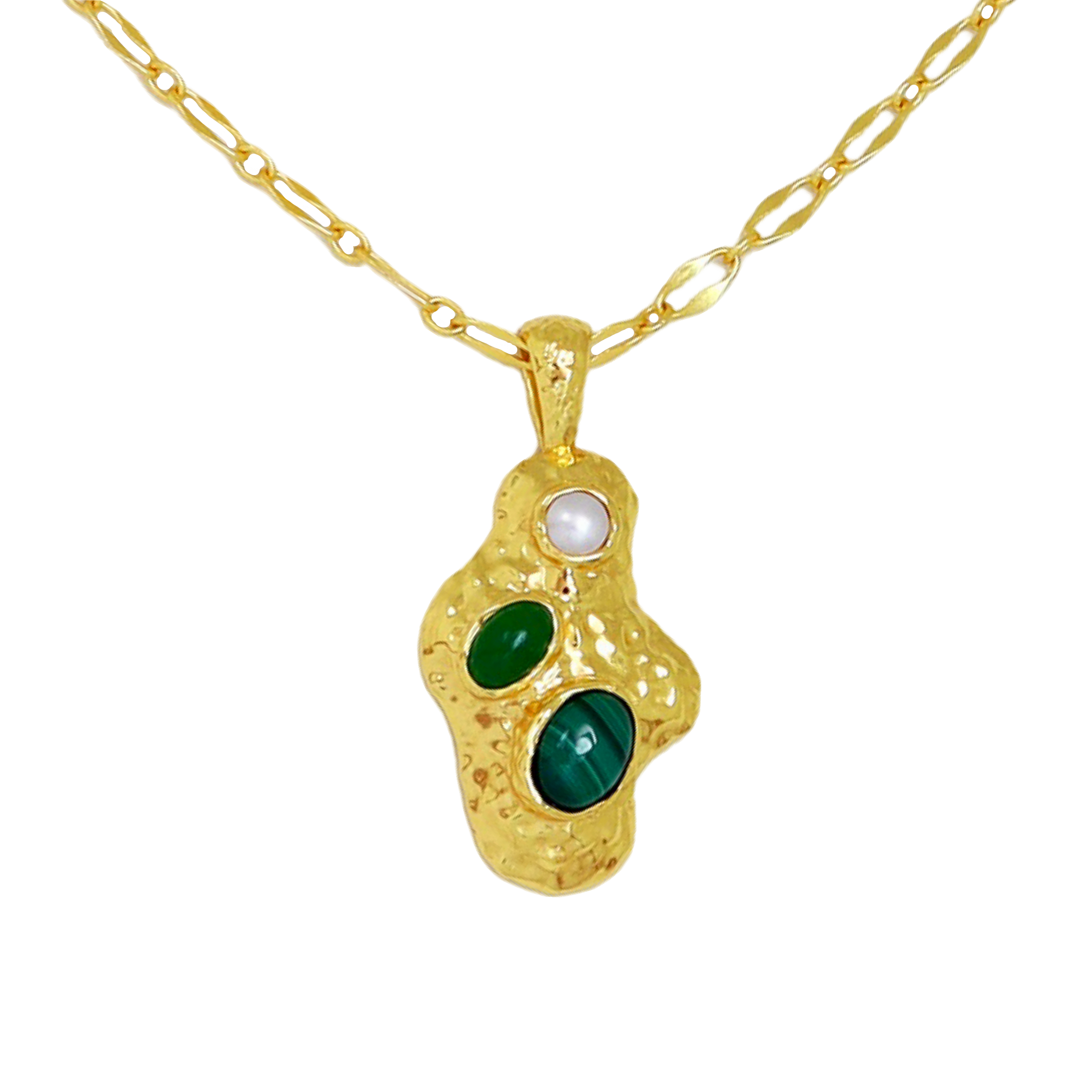 Softly sculptural and rich with meaning, Federica is designed to feel like something discovered - not just worn. A vintage-inspired chain leads to an organic, freeform pendant set with Green Jade, Malachite, and Freshwater Pearl, creating a piece that feels both grounded and elevated.