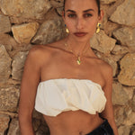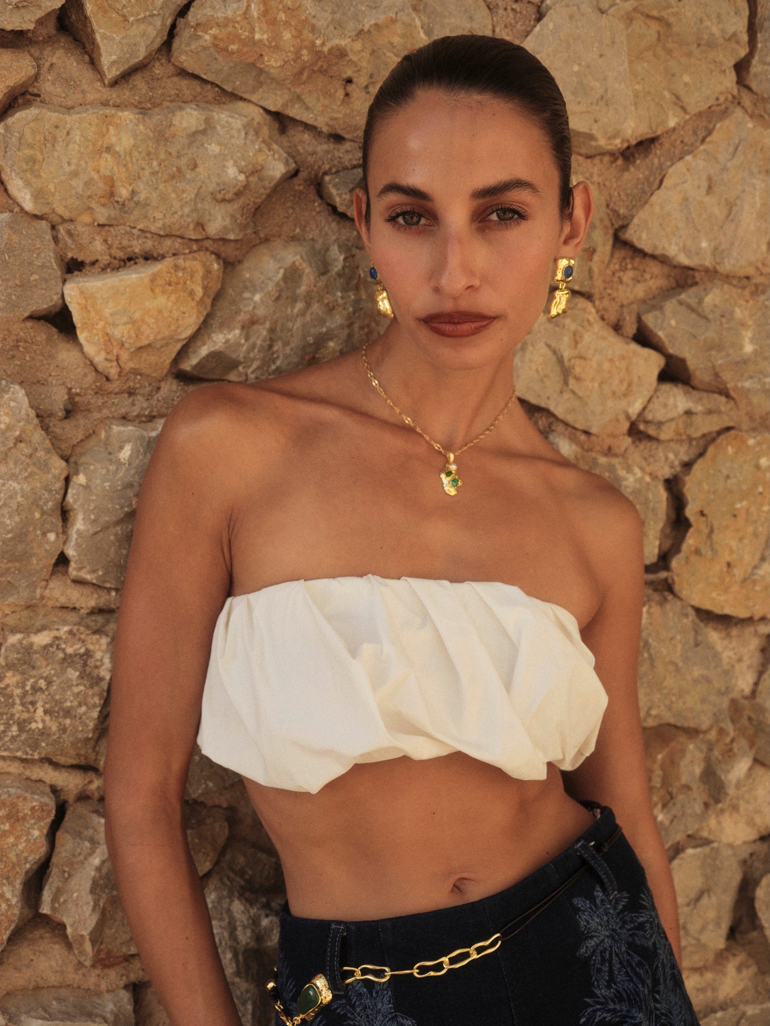 Open neckline, sun-warmed skin, gold layers - effortless presence.