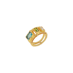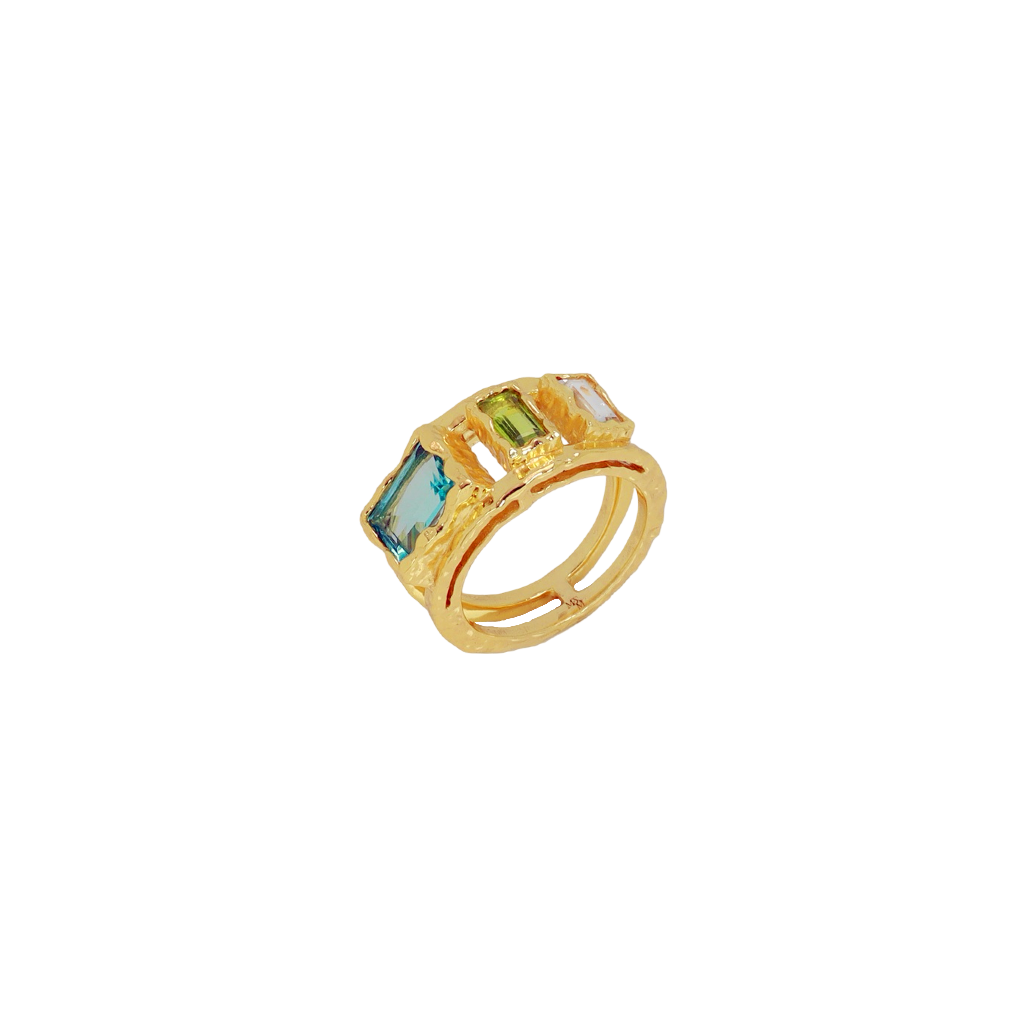 Maral is a study in balance - two slim hammered bands anchored by three luminous stones in softly irregular bezels. Glass Aquamarine, Glass Peridot, and White CZ bring light, colour, and quiet strength to the piece.
