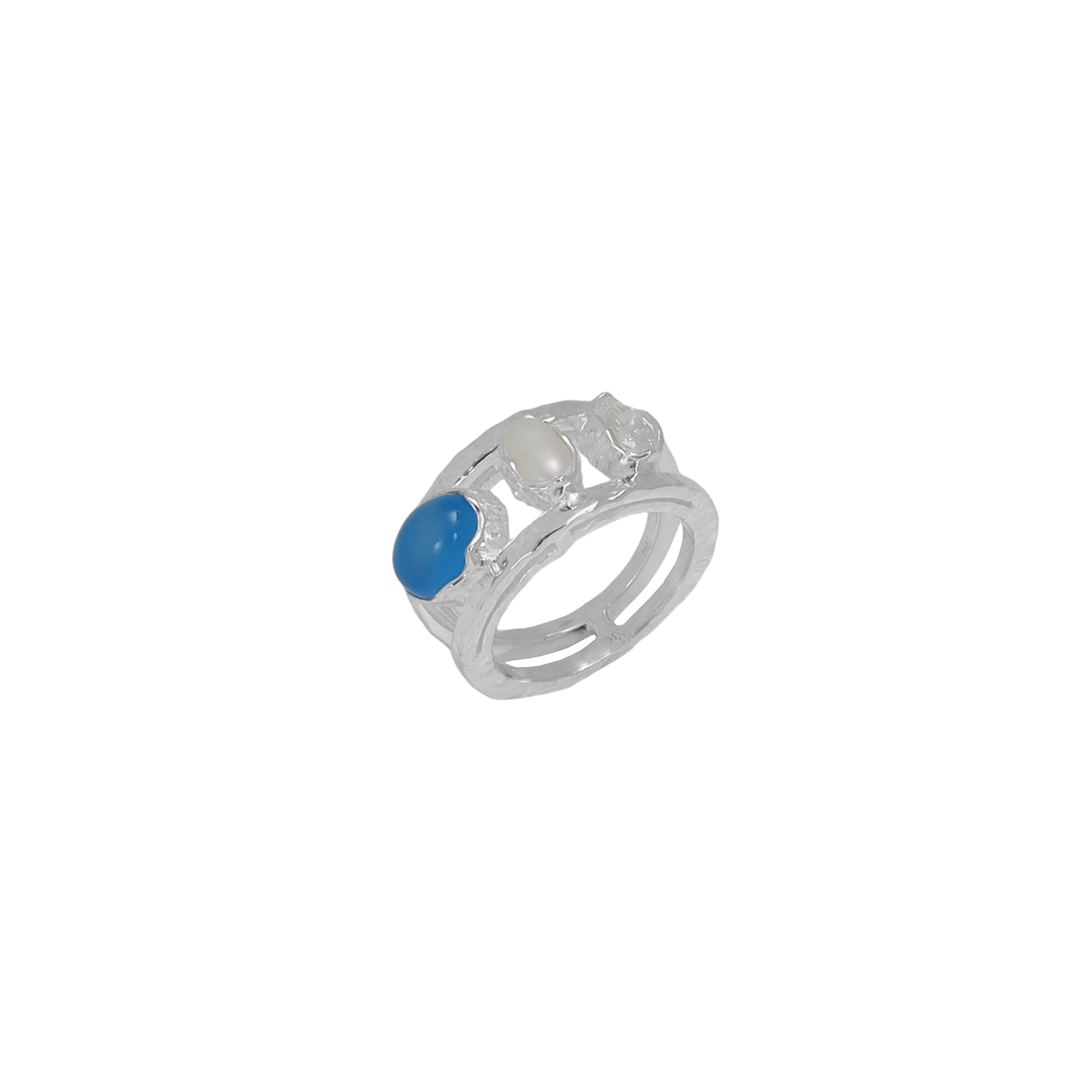 Maral in silver feels lighter, cooler, and quietly striking. Two slender hammered bands frame three distinct stones — freshwater pearl, blue chalcedony, and white CZ — each set in organic bezels that give the piece an imperfect, lived-in beauty.